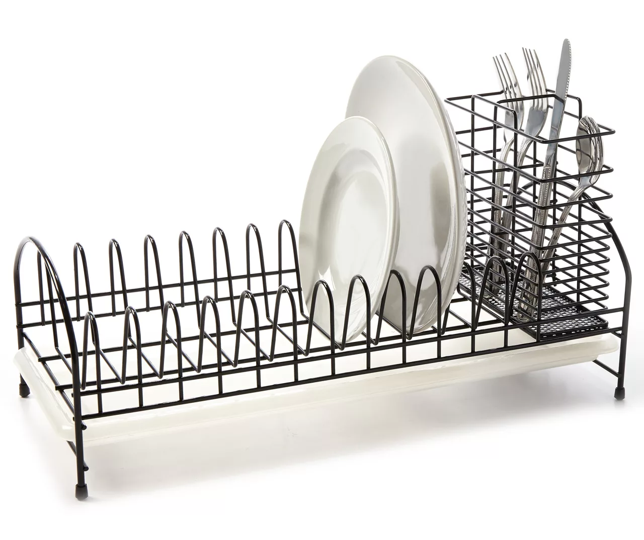 Make drying your dishes a breeze with this durable rack from Farberware. The slim design allows this dish drying rack to fit perfectly on the counter. Constructed with metal dividers to hold a dozen plates. The removable wire flatware caddy is ideal for all your utensil sorting needs.