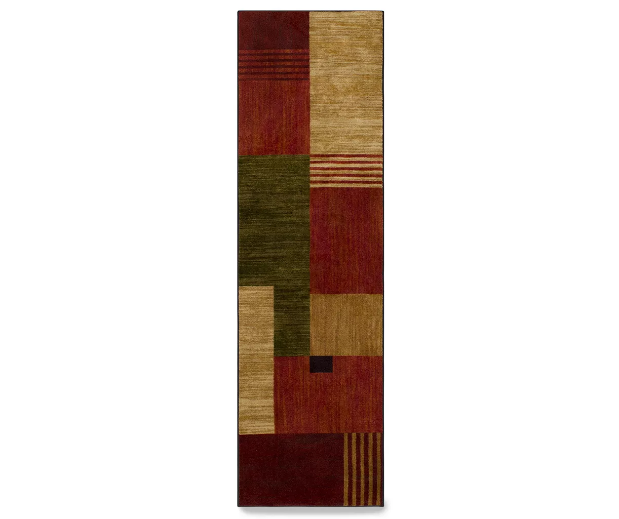 - Rich shades of red, tan and olive