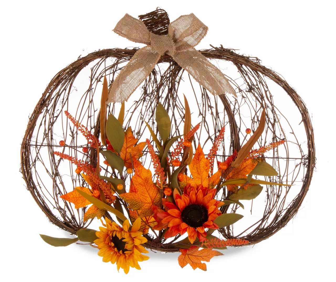 Create a lovely autumn display in your home using this piece inspired by nature. Rattan is shaped like a pumpkin as an artificial arrangement of fall leaves, sunflowers and berries displays on the bottom. It’s a beautiful seasonal addition to a living space, dining room or entryway.