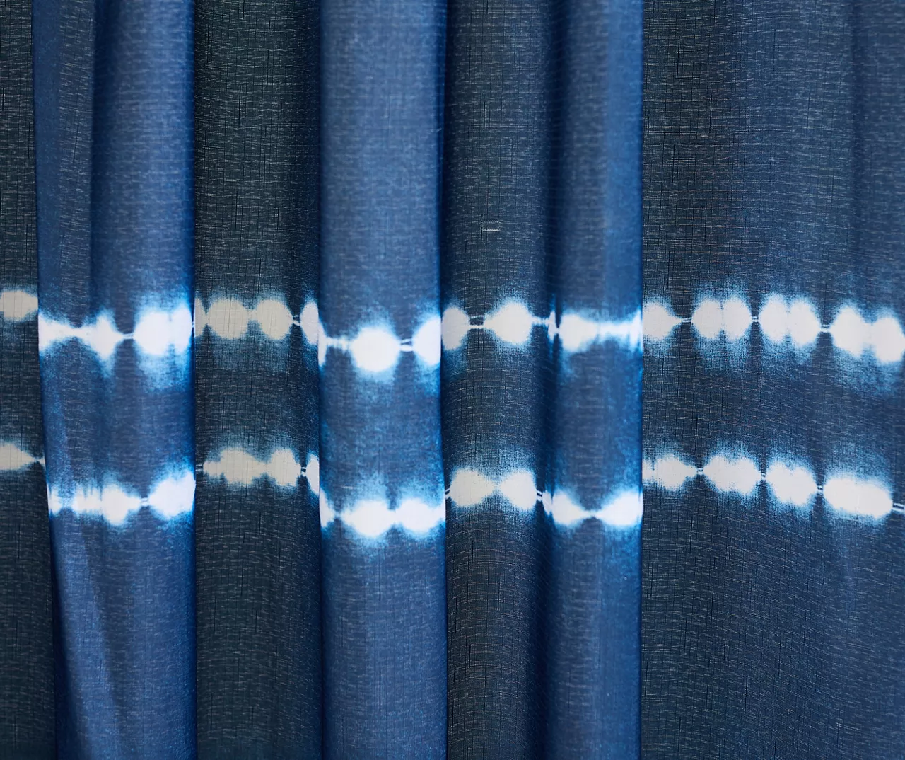 - Woven textured polyester curtain with white ink blot stripe pattern on a navy blue background