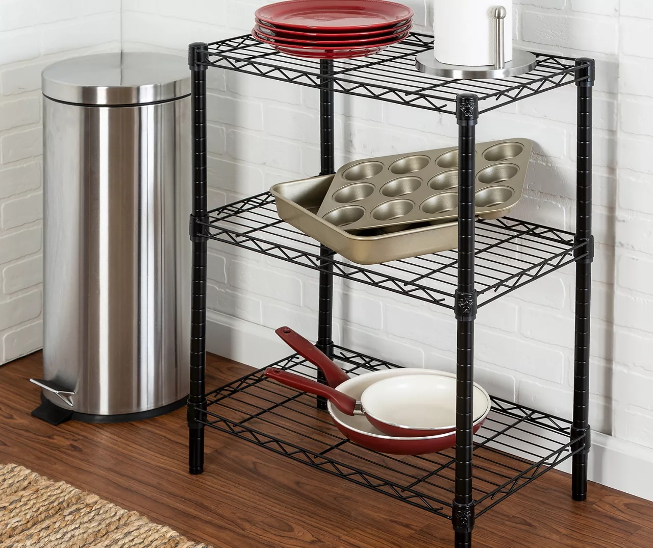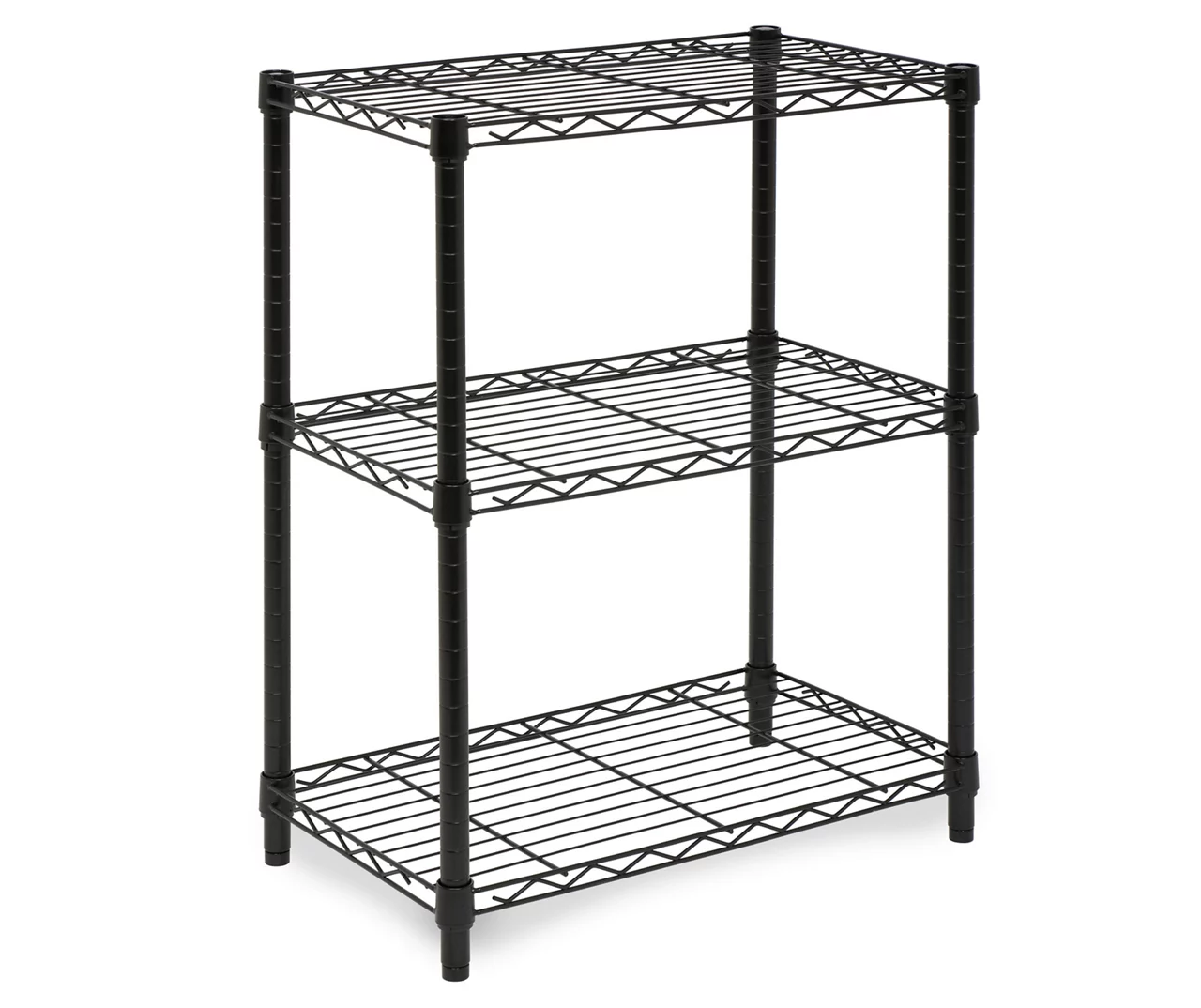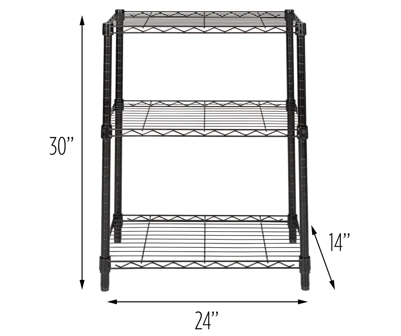 Restore order to your space with this three-tier heavy duty adjustable shelving unit. Its commercial-grade durability is tough enough for any of your kitchen shelving needs or to tame your wardrobe gone wild, while its steel grated shelves allow your garments plenty of breathing room. Easy to assemble and versatile, this adjustable shelving unit also straightens up messes in your basement or garage.