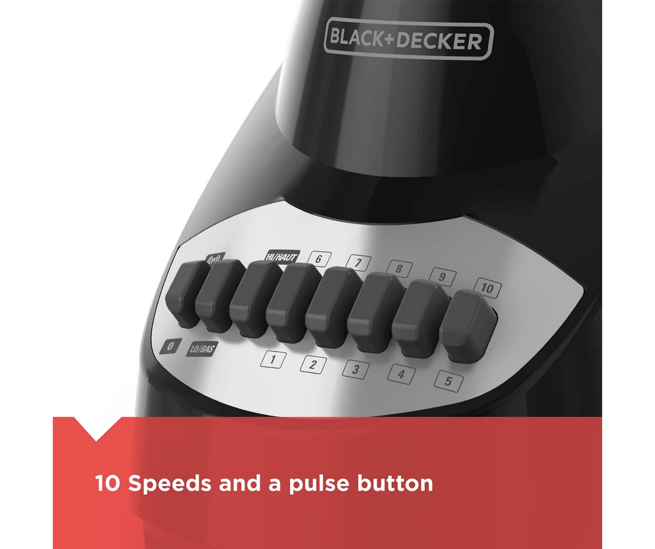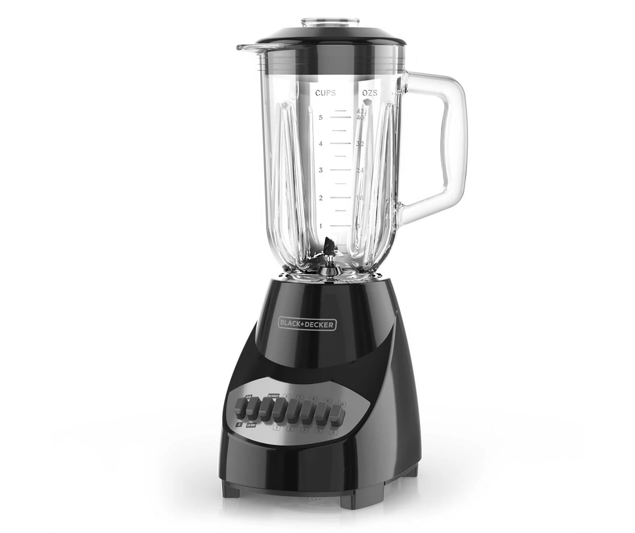 The Black + Decker 10-Speed Blender is a kitchen classic. With 10 speeds and a pulse control, operation is simple and efficient. The durable glass 5-cup (40-oz.) jar is easy to pour from and holds several servings of your favorite soups, smoothies, frozen mixers, and more! Plus, cleanup is a breeze thanks to the dishwasher-safe removable parts.