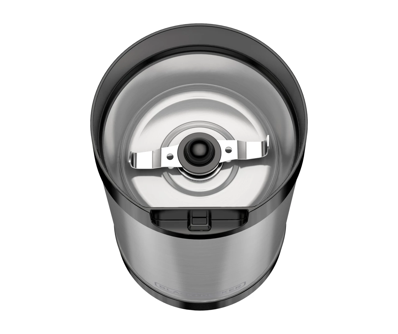 Grind your favorite flavored brews in no time with this convenient coffee grinder from Black & Decker. Featuring a sleek metal design that looks great on a counter, the grinder features stainless steel blades that pulse through beans and nuts at the simple push of a button. Rubberized feet prevent it from moving as a convenient locking lid keeps coffee grounds off of the floor or counter.