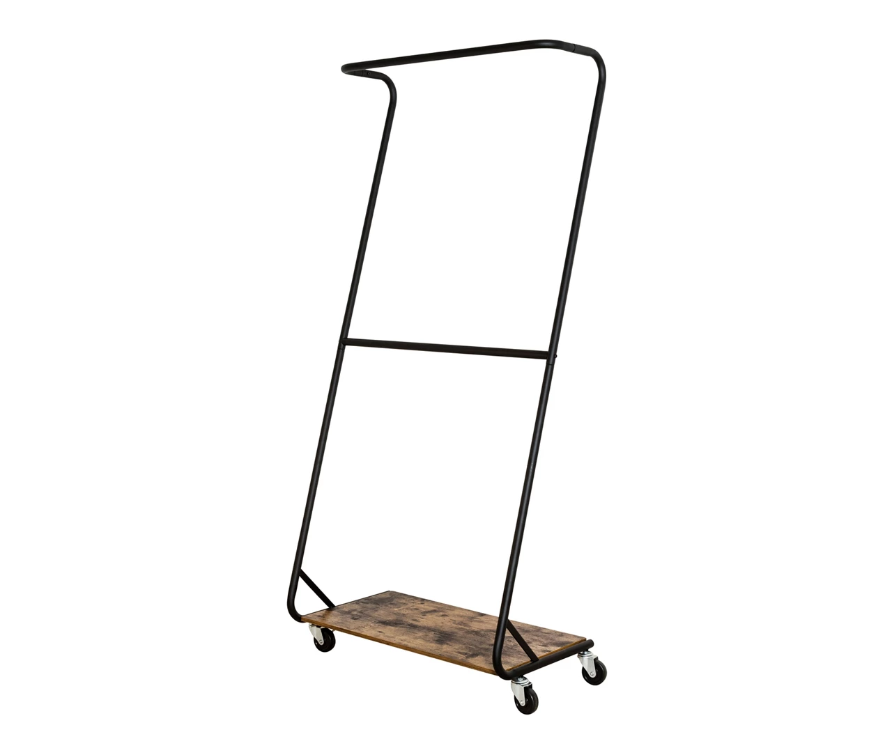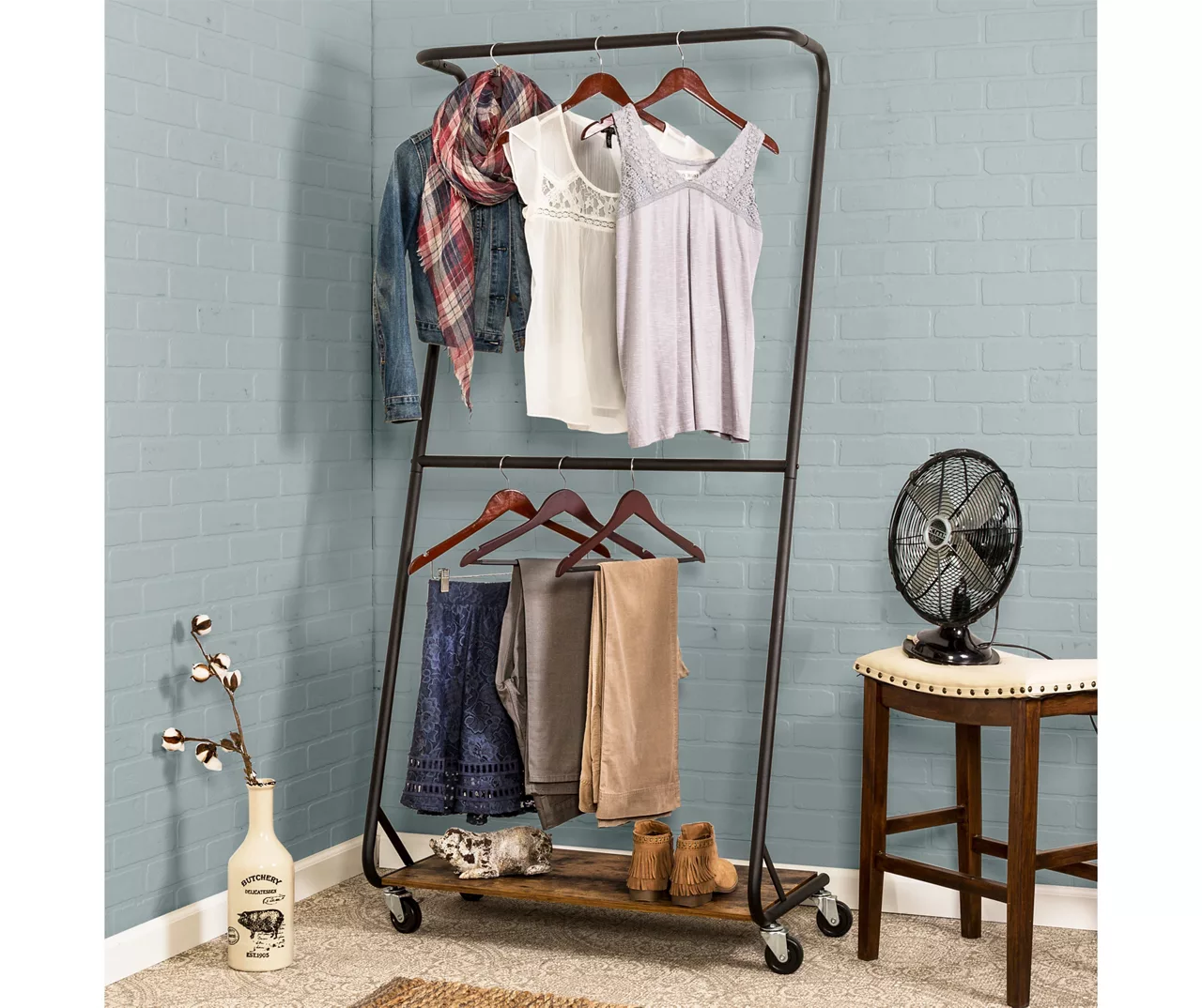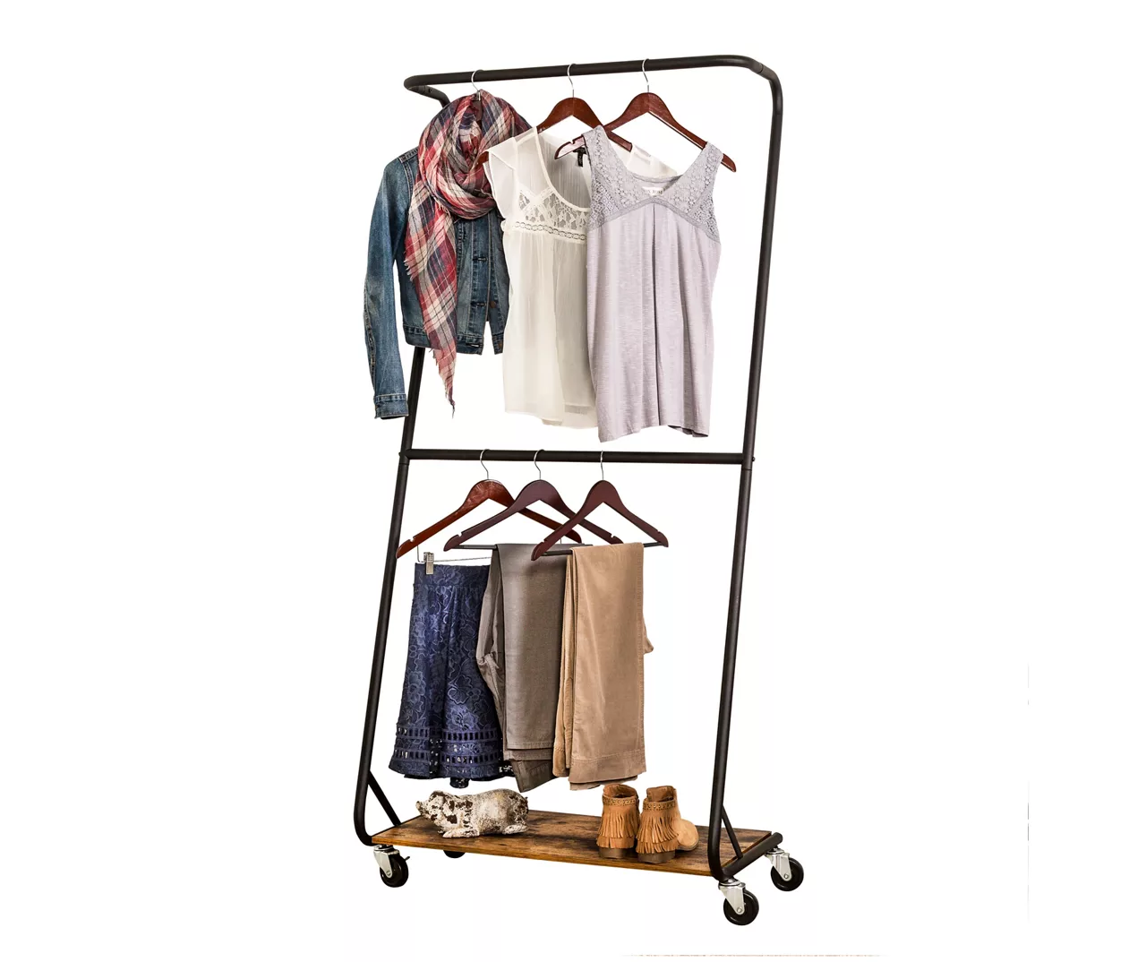 With this handsome matte black steel Z-frame clothes rack from Honey-Can-Do, you can makes a modern style statement in any bedroom while maximizing your room’s layout. Its double bars provide ample hanging space for multiple garments and a cool rustic wooden shelf along the bottom makes it easy to add shoes, storage bins and other items.