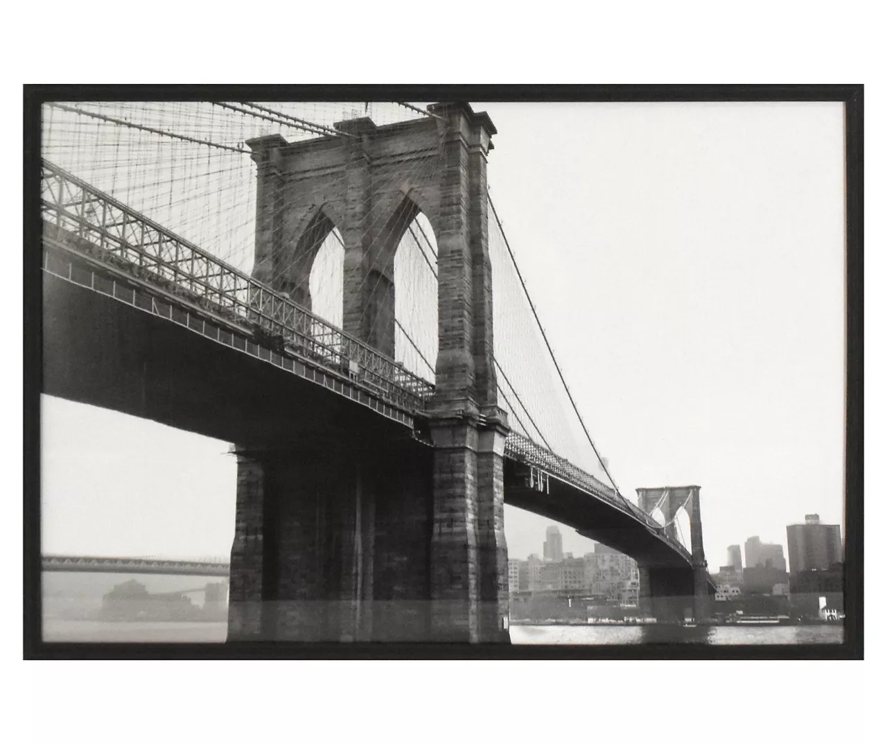 Add an architectural accent to your living space, bedroom or guest room with this lovely framed photograph of the famous Brooklyn bridge. The black-and-white palette adds quiet sophistication to the style, and the simple black frame finishes the look with modern minimalism.