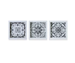 The Black and White Tiles framed gel-coated distressed three-piece set brings a bold and stylish touch to your home décor. Each deco box features an intricate medallion design in neutral hues, for a striking and contrasting update. A gel coat finish on distressed paper base provides a rich texture and light gloss finish, while the white frame provides a neat shadowbox effect. Display the pieces together horizontally or vertically to fit any space or hang them separately for a stylized approach. This set is perfect to add some style and pattern to any entry way, kitchen or bathroom.