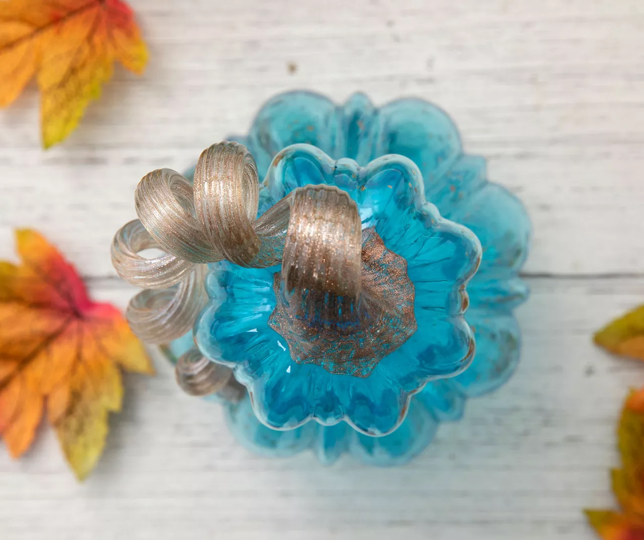 This decorative gourd creates an interest and festive look among your autumn decorations. The curvy shaped body with classic ribbed sides is beautifully colored in a blue hue and features speckles of gold. Complete with a textured curled stem on top, it’s a wonderful addition to a mantel, table or shelf.