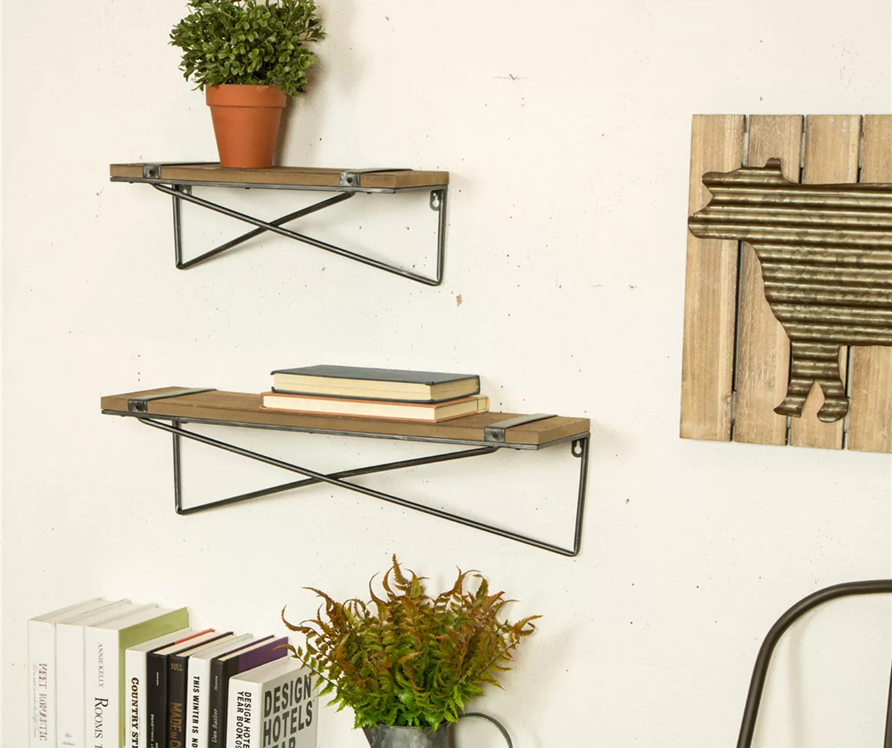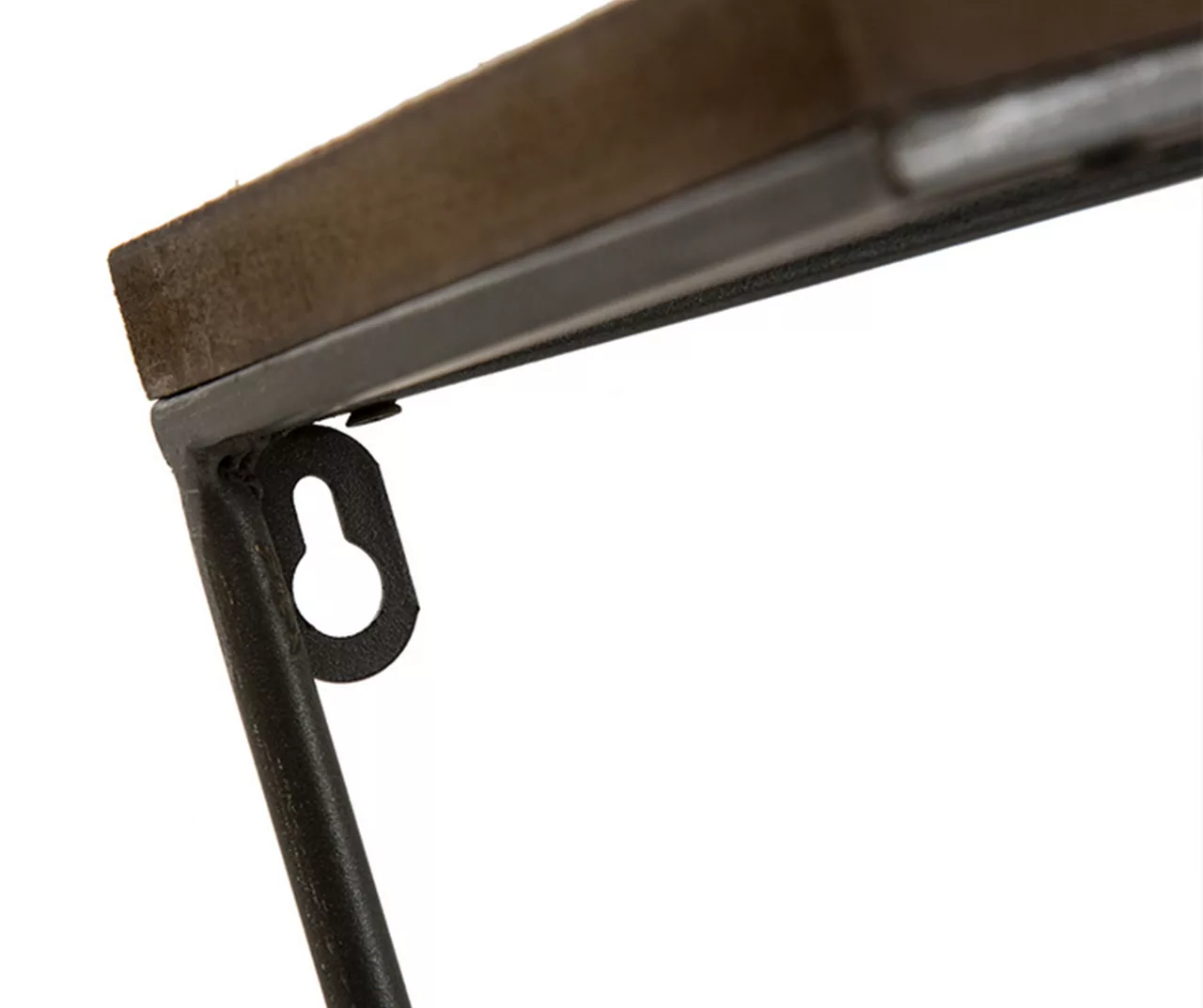 Crisscrossing bars underscore the dark wood platform of this wall shelf topped by black metal accents for industrial flair. Keyholes in the back make installation quick and easy, and a variety of sizes lets you customize your decorative arrangements to suit your needs.