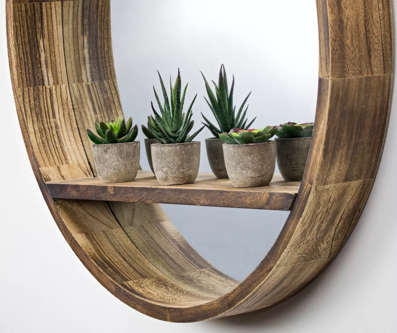 This beautiful wooden wall mirror also serves as a storage shelf for small items such as mementos, figurines and photos. Made from real wood that has a natural brown wood stain, this wall mirror with shelf is a wonderful way to open up a small living room or bathroom, or place it opposite a window to cast diffused light with a cozy and rustic look. It looks wonderful in a bedroom, bathroom, living room or dining room, commanding attention and pulling focus.