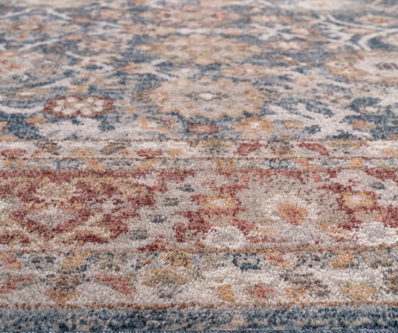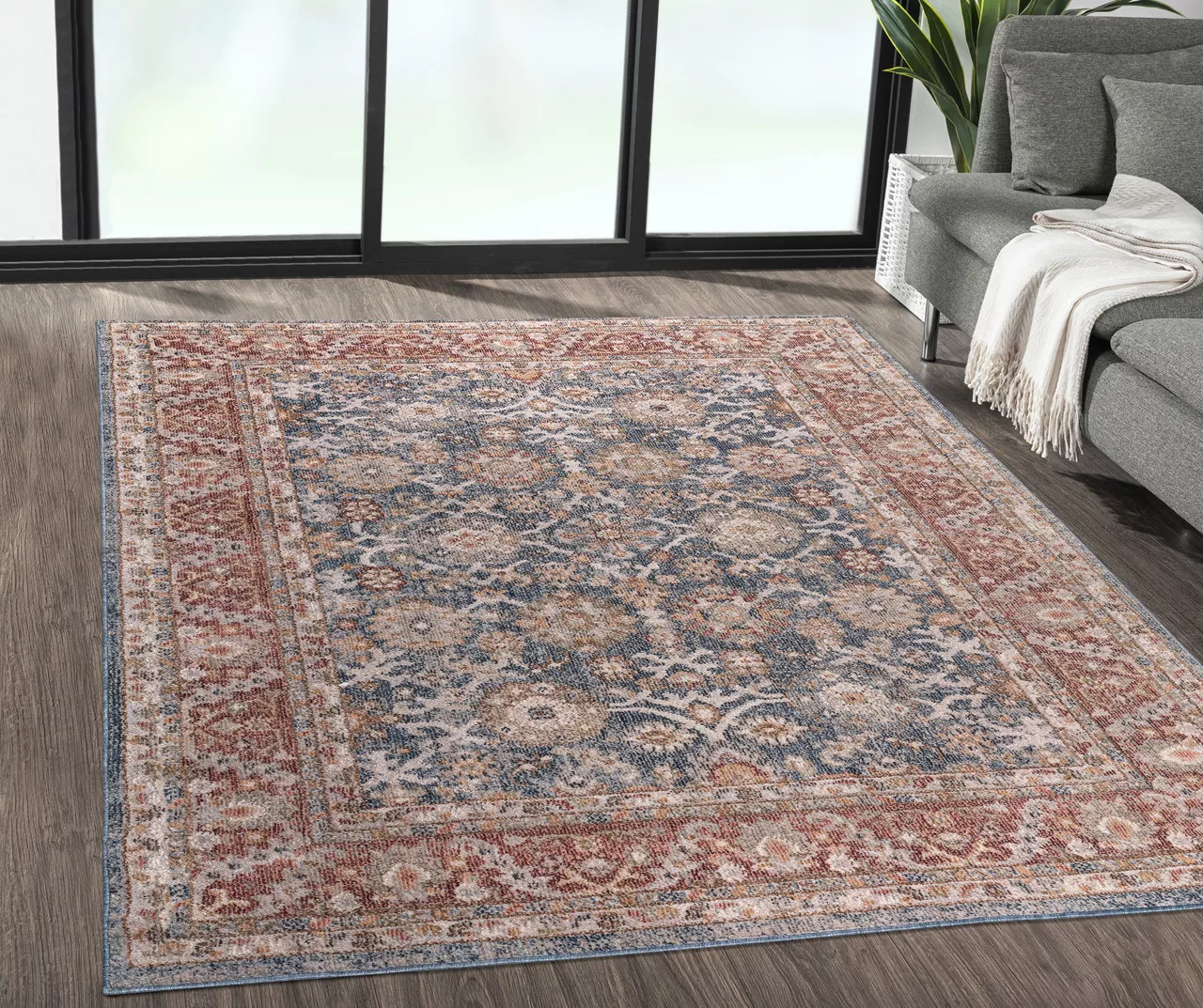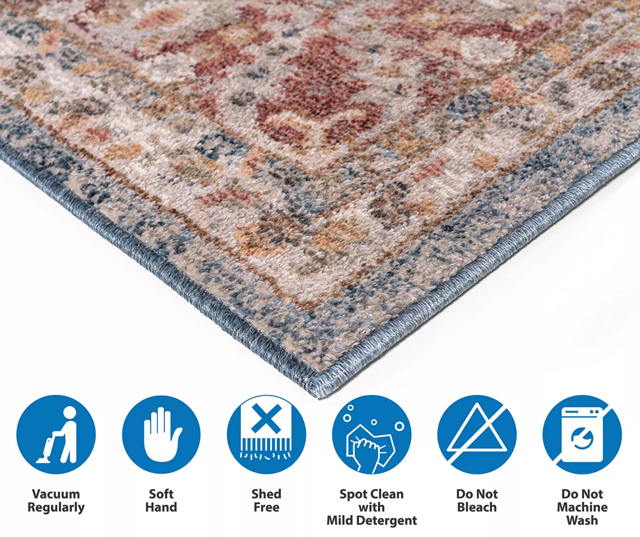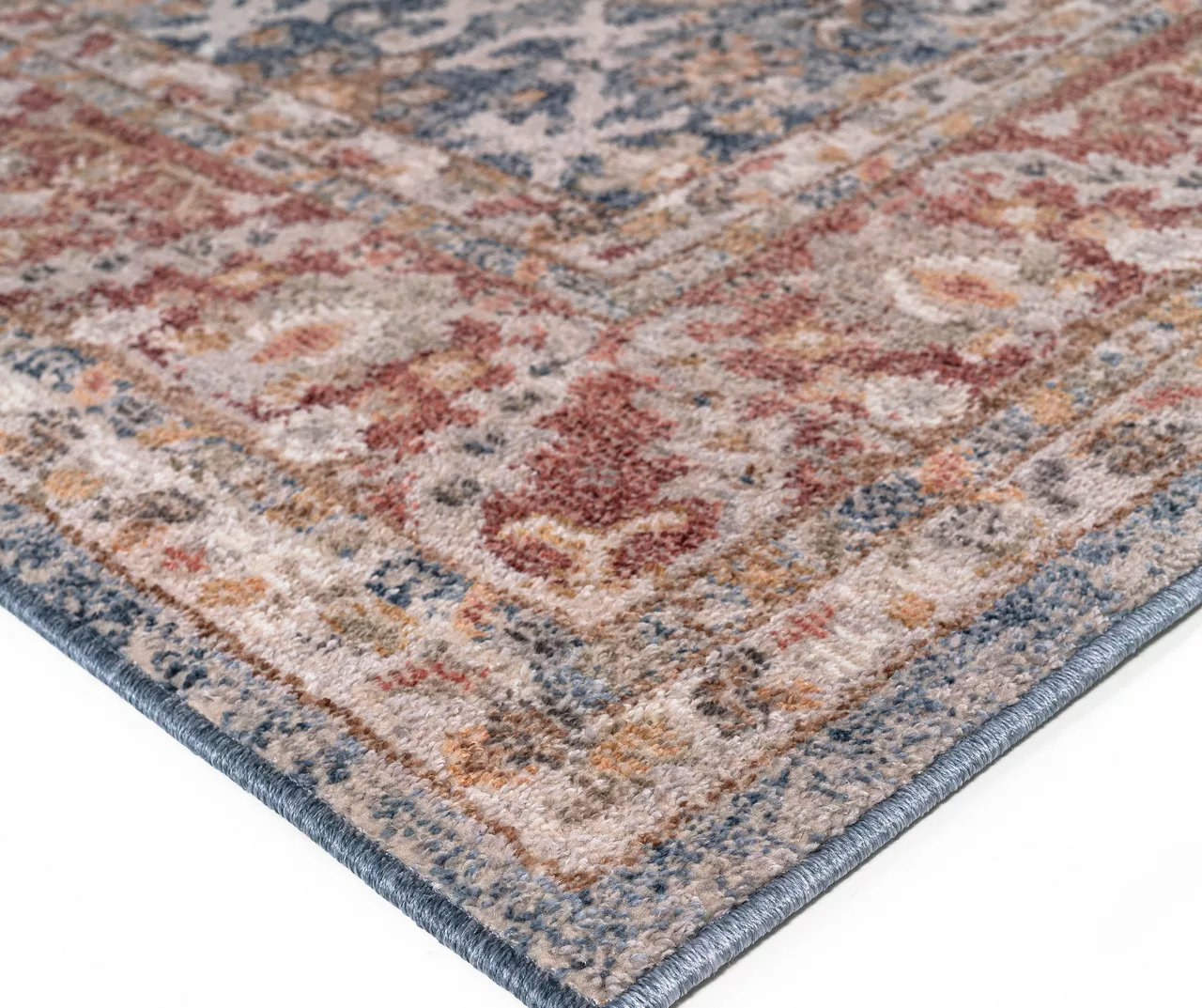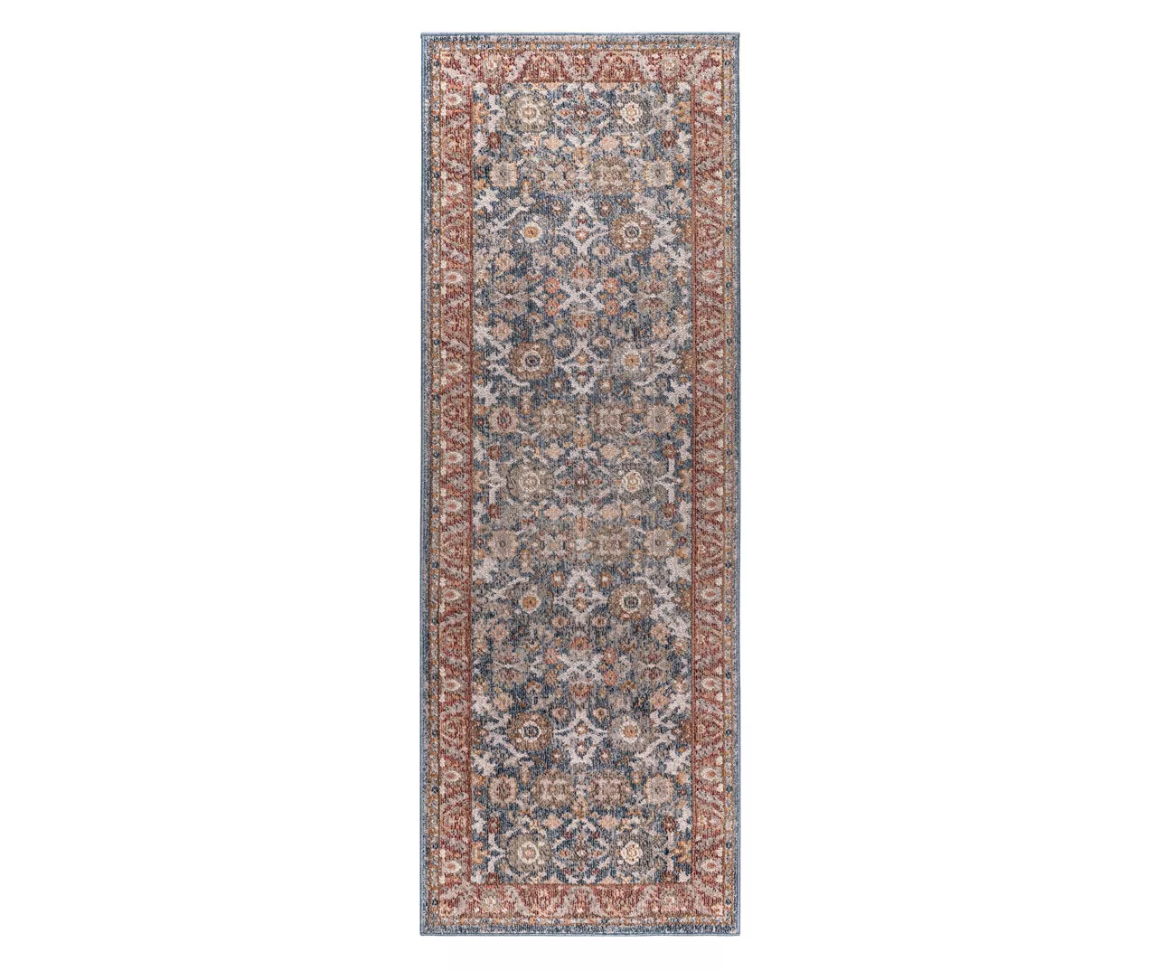 The Caitlyn area rug brings a touch of beauty to elevate your decor through its traditional Persian design with a patterned border in rich shades of blue and red for an elegant look. The soft, medium pile makes the woven rug well-suited for high-traffic areas, while the transparent sprayed latex reverse helps keep the rug from sliding. A rug pad is still highly recommended to keep the rug in place. Stain- and fade-resistant, this woven area rug is perfect for your living room, family room, or entryways.