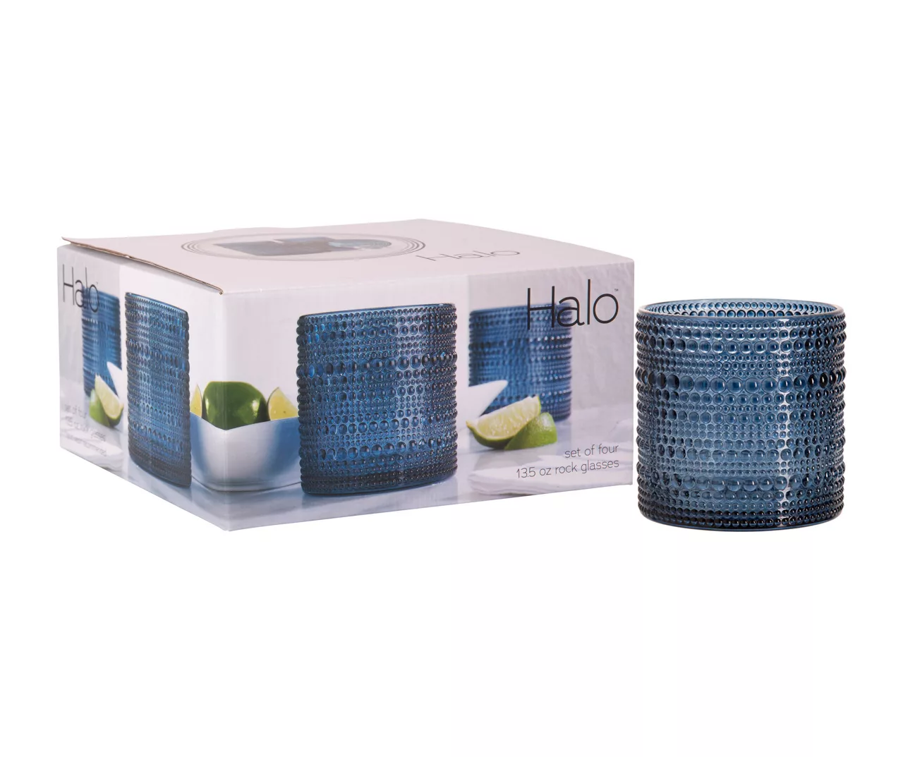 Entertain and sip in style with this set of four rocks glasses. Each glass features a memorable embossed design and cobalt blue glass finish that effortlessly complements your existing barware.