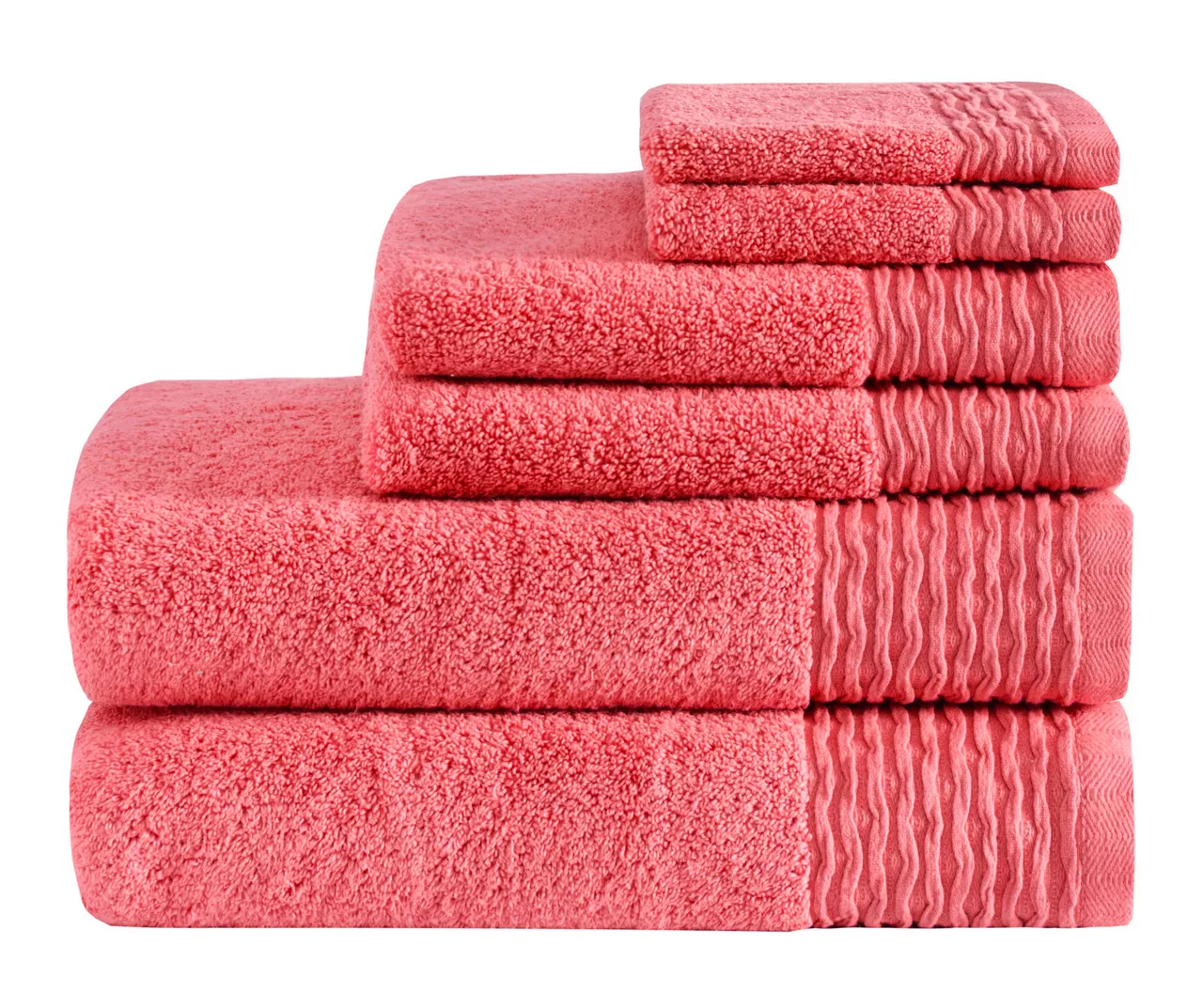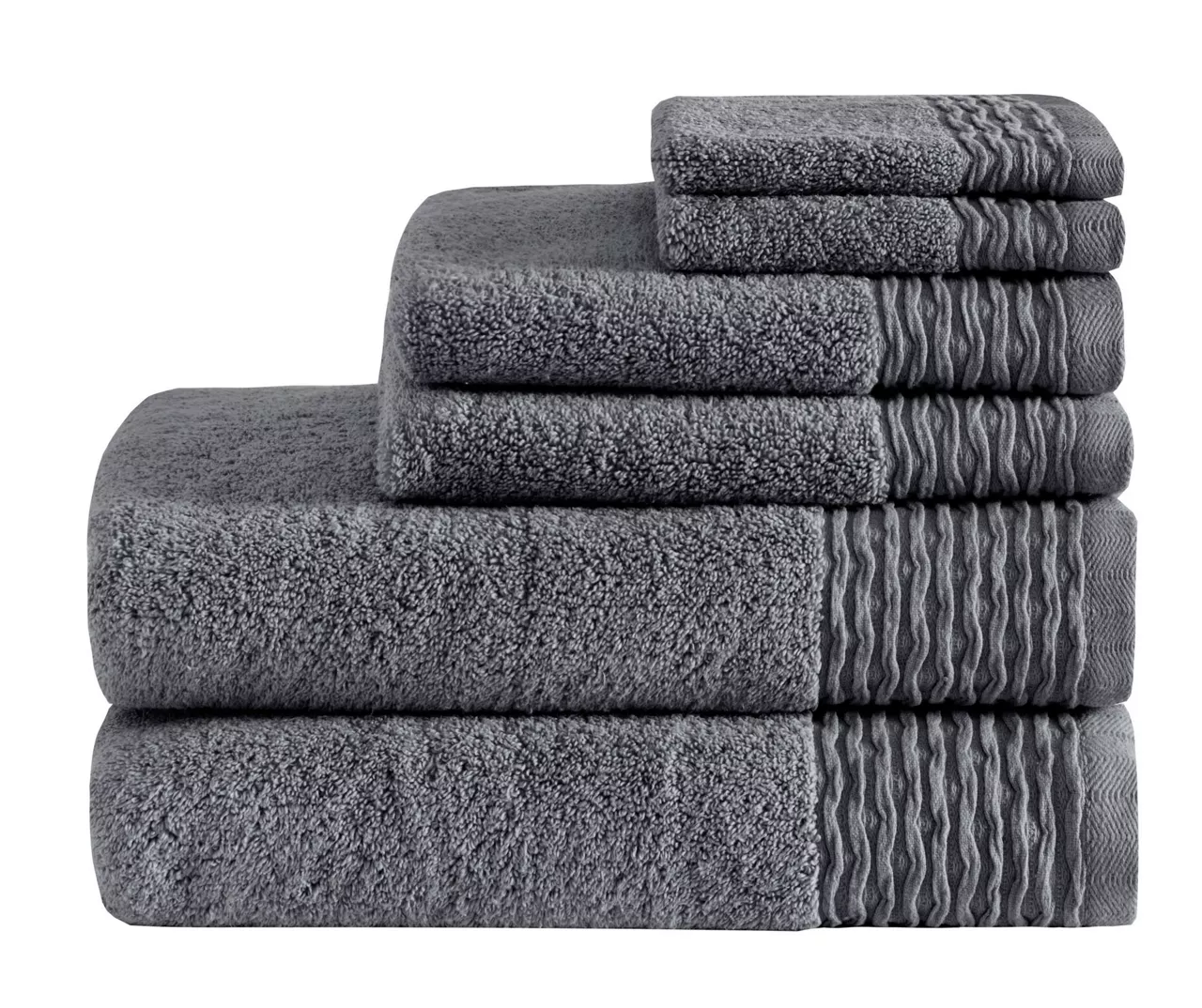 Crafted from absorbent and quick-drying cotton, this 6-piece towel set brings simple spa-worthy style to your bathroom, and can be tossed in the washer and drying for easy care. The anti-microbial treatment helps to inhibit bacterial growth for odor control so they stay fresh for longer. Each towel features a curving, wavy jacquard accent for modern flair.