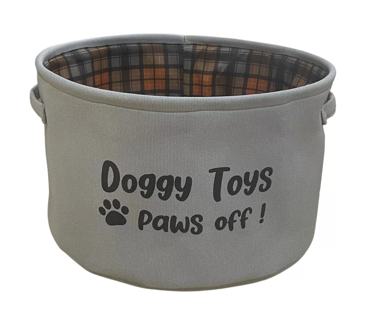 A darling way to corral your pet’s toys from all over the house, this charming bin features a cheeky “doggy toys paws off” message and a plaid interior to effortlessly complement your space.