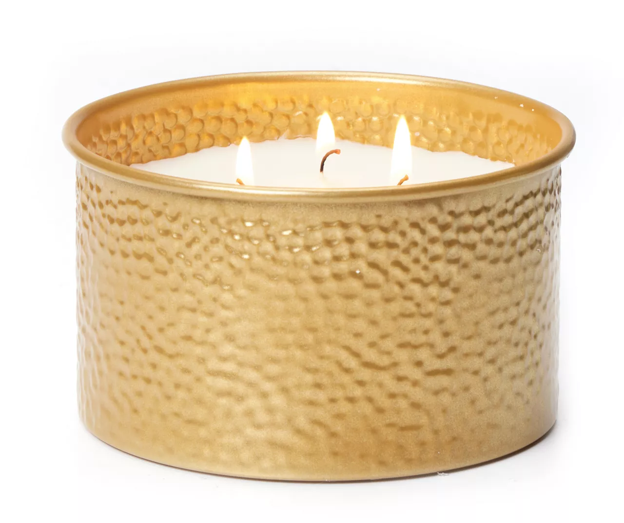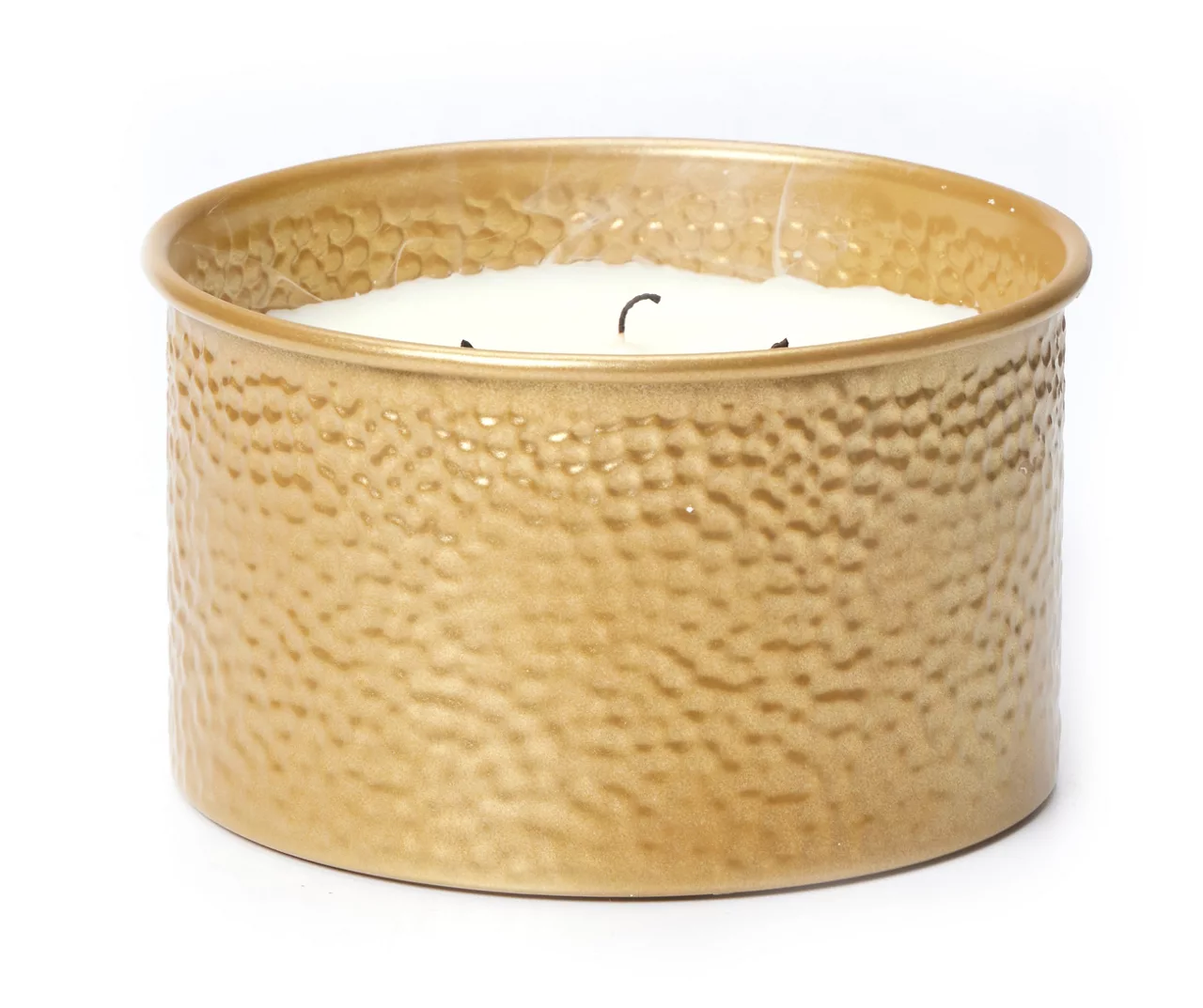 Housed in a golden hammered tin, this 3-wick candle brings a dash of modern elegance to your decorative displays. The white wax is infused with a soothing blend of bergamot, citrus, herbal, eucalyptus, aldehyde, sage, wood and tea notes for an inviting aroma in your living space.