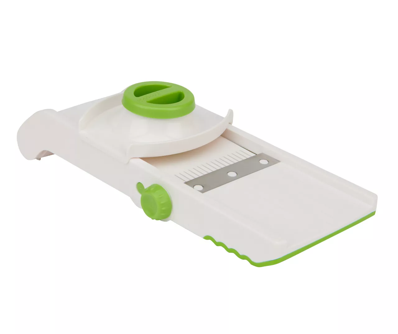 Perfect for slicing fruits, vegetables and cheeses, this mandoline slicer from GoodCook is a versatile addition to your kitchen collection. Adjustable knobs on either side of the mandoline adjust the thickness of the slice or converts the blade from straight cuts to julienne. The non-slip foot keeps the mandoline secure when used on the counter or bridged across the rim of a bowl. A food guide is included to keep fingers protected and grip onto shorter pieces of food as you slice.