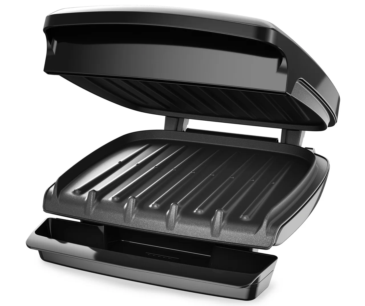 This grill features a cooking surface that creates healthy meals for four servings. You save over half the time compared to pan cooking. Who doesn’t want to lose the fat, not the taste? With its exclusive fat draining design, this grill removes up to 42% of fat. The nested tray controls spills and drips. Advanced George Tough Non-stick Coating is an industry leading coating 3X more durable than previous coatings and PFOA-free. With breeze through clean-up, this advanced non-stick coating easily wipes clean.