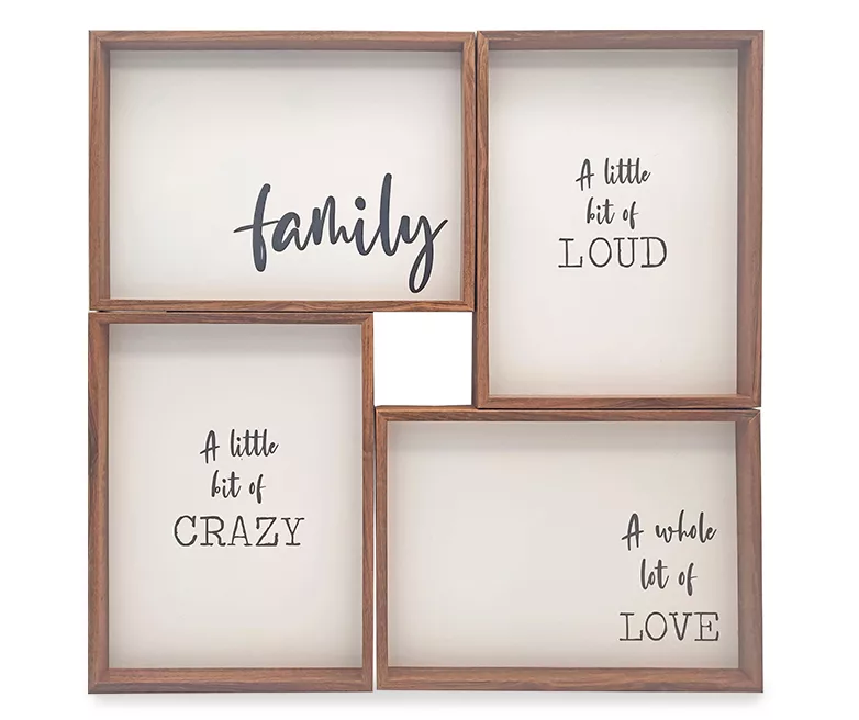 This lovely four piece canvas is the ideal addition to your bedroom or living room. With its heartwarming “family, a little bit of loud, a little bit of crazy, a whole lot of love” message and lovely framed design, these beautiful canvases are sure to bring some love to your home.