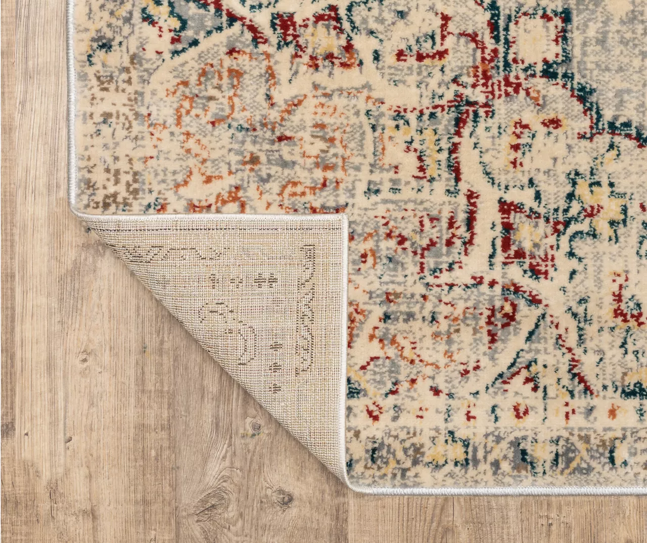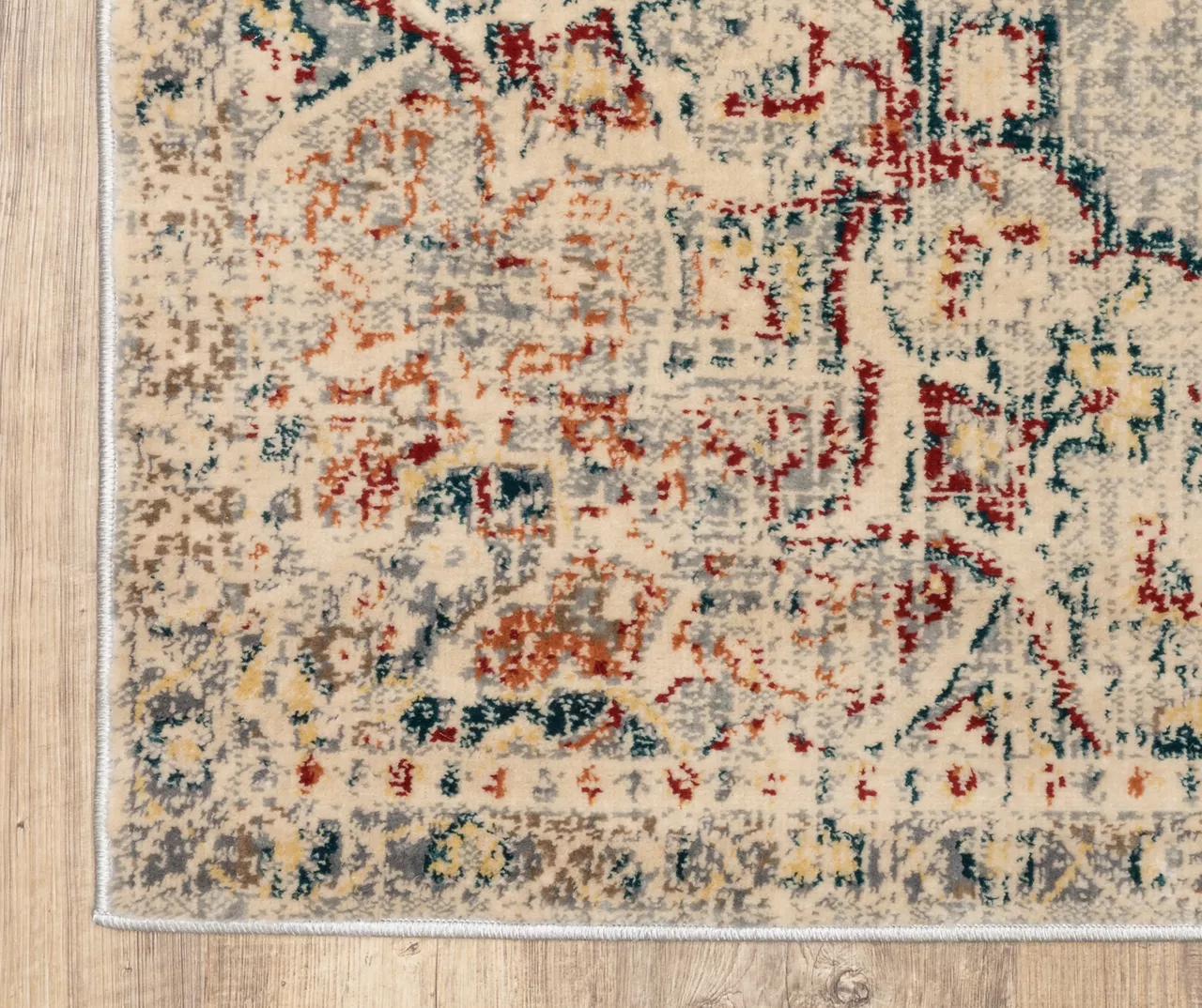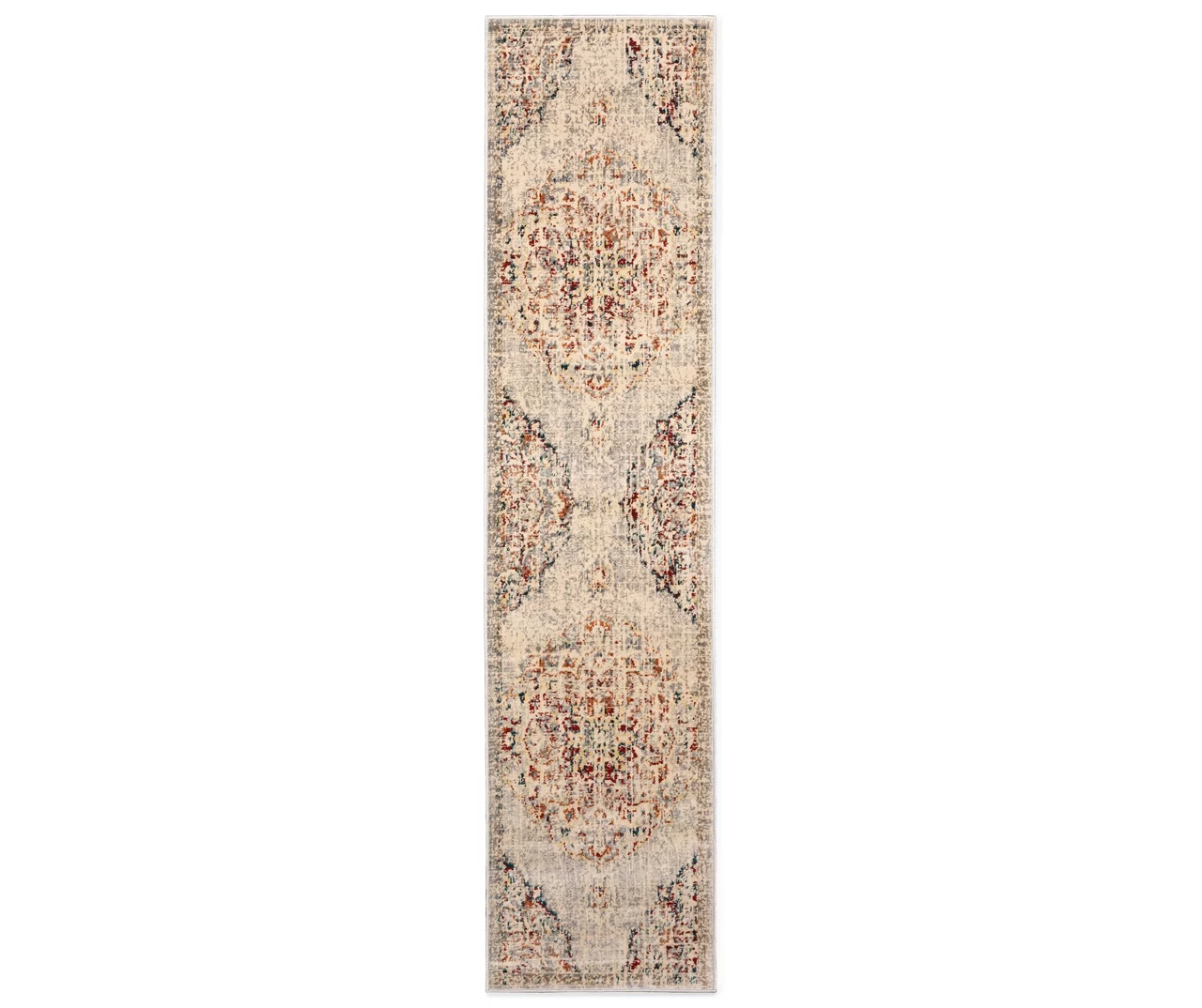 This medallion patterned rug features warm, tonal neutrals with pops of red, orange, blue and gold. Machine-woven of soft polypropylene, it showcases global and traditional Persian patterns with distressing to add vintage appeal to any decor.