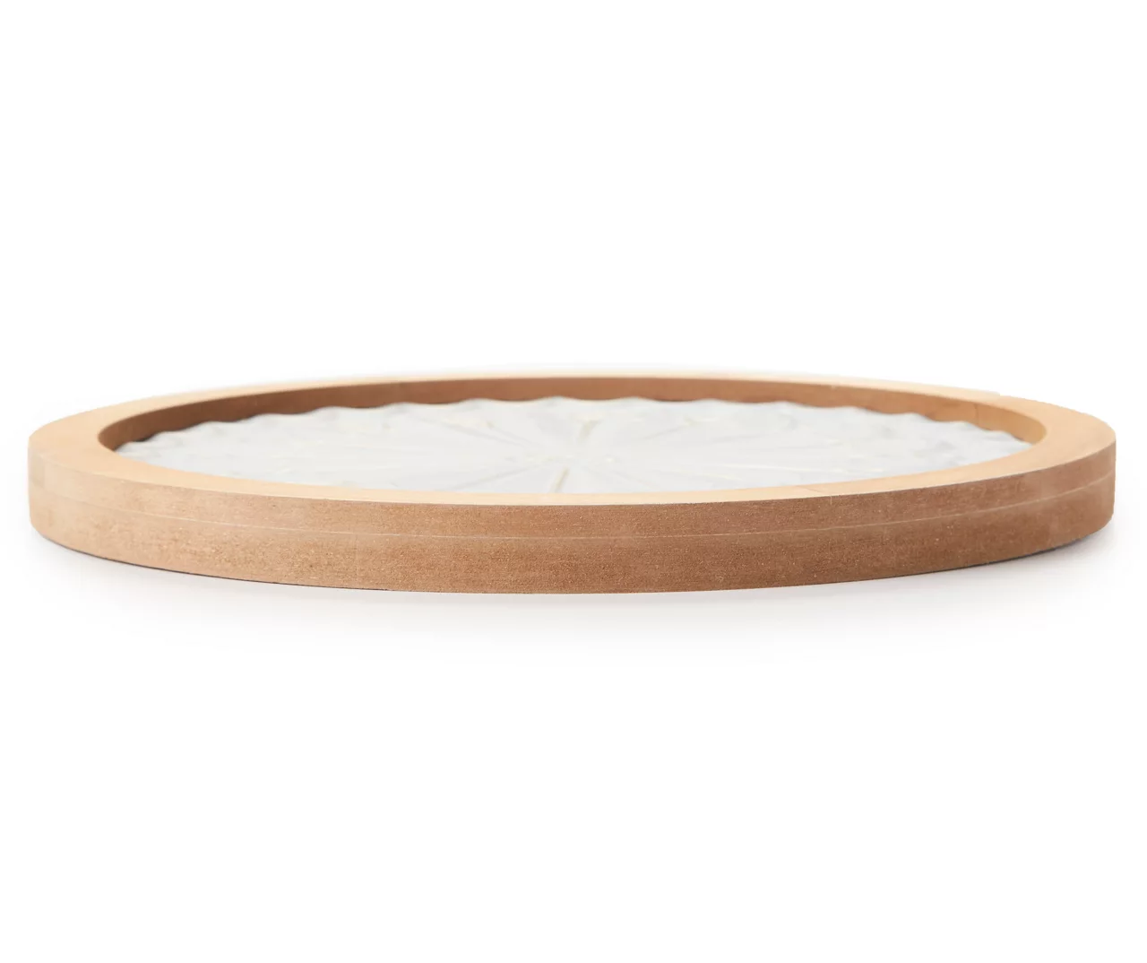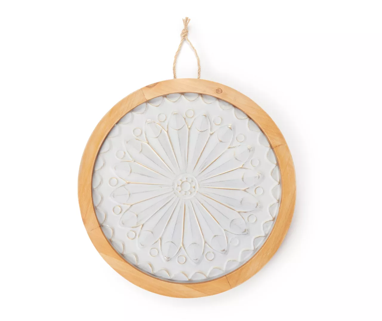 With a rounded shape, embossed detailing, weathered finish and brown wood frame, this medallion plaque brings rustic elegance to your walls, and can be easily hung thanks to a jute rope at the top.