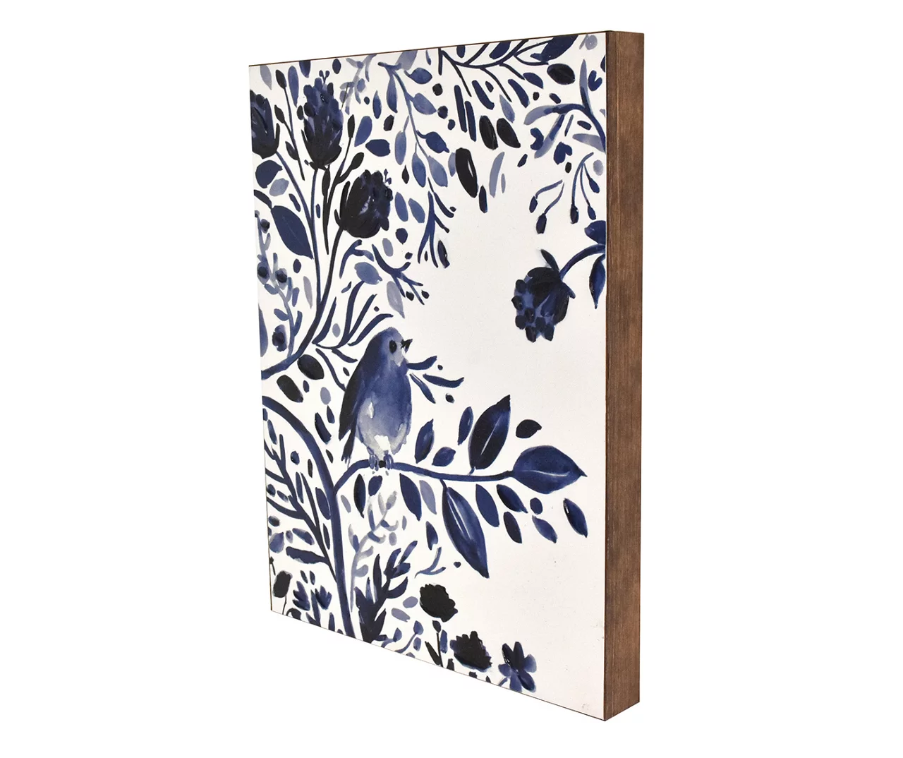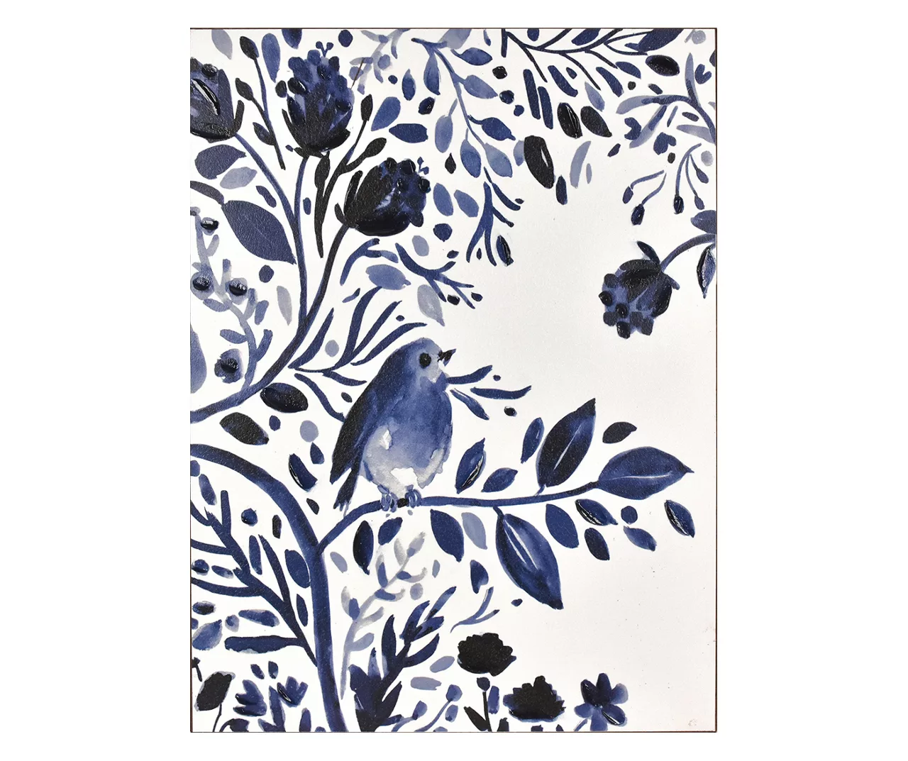 This wall art brings adorable artistry to your home. The blue ink-like illustration depicts a bird resting among leaves, branches and flowers on a white background.