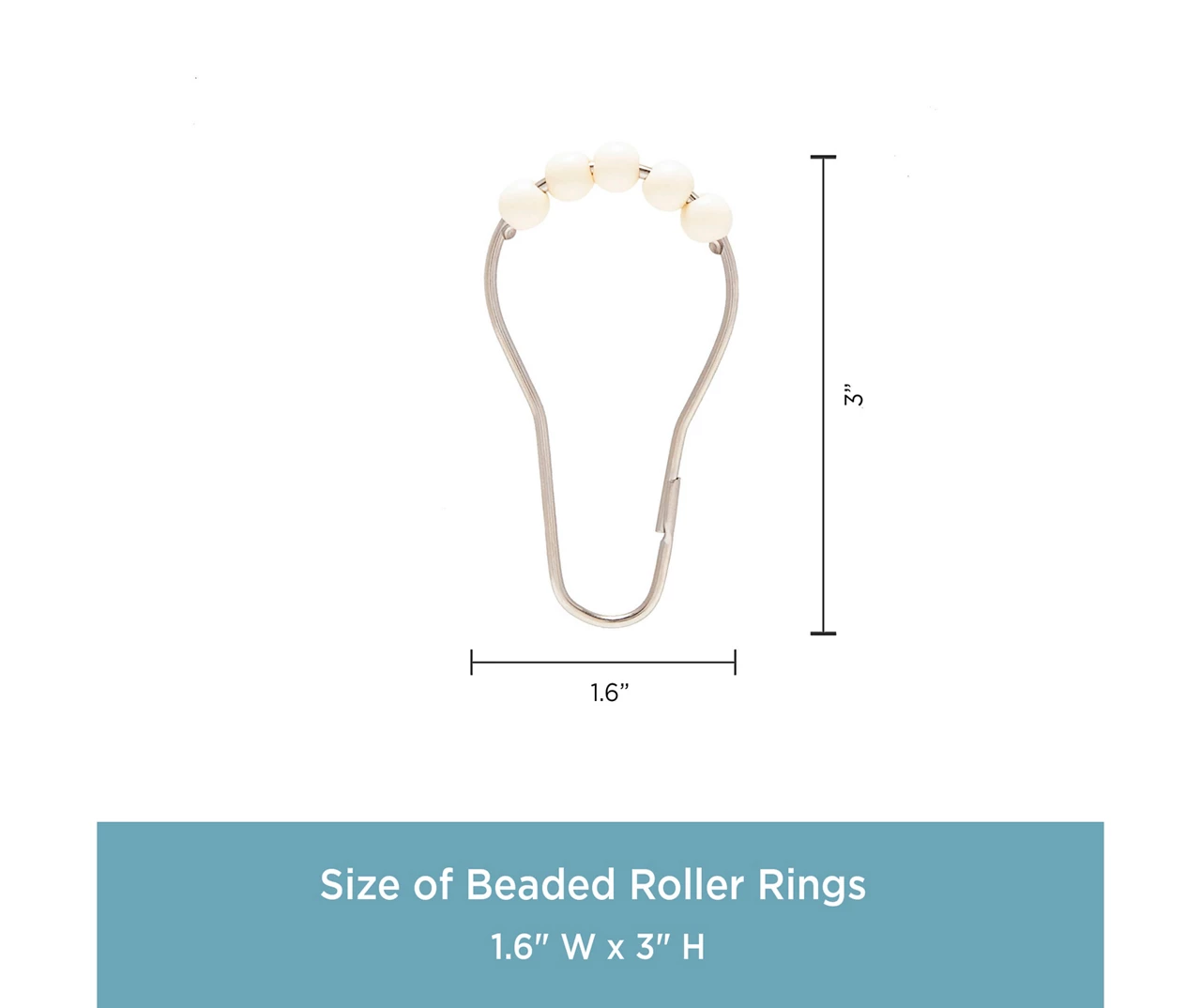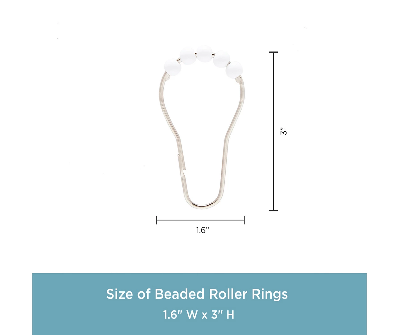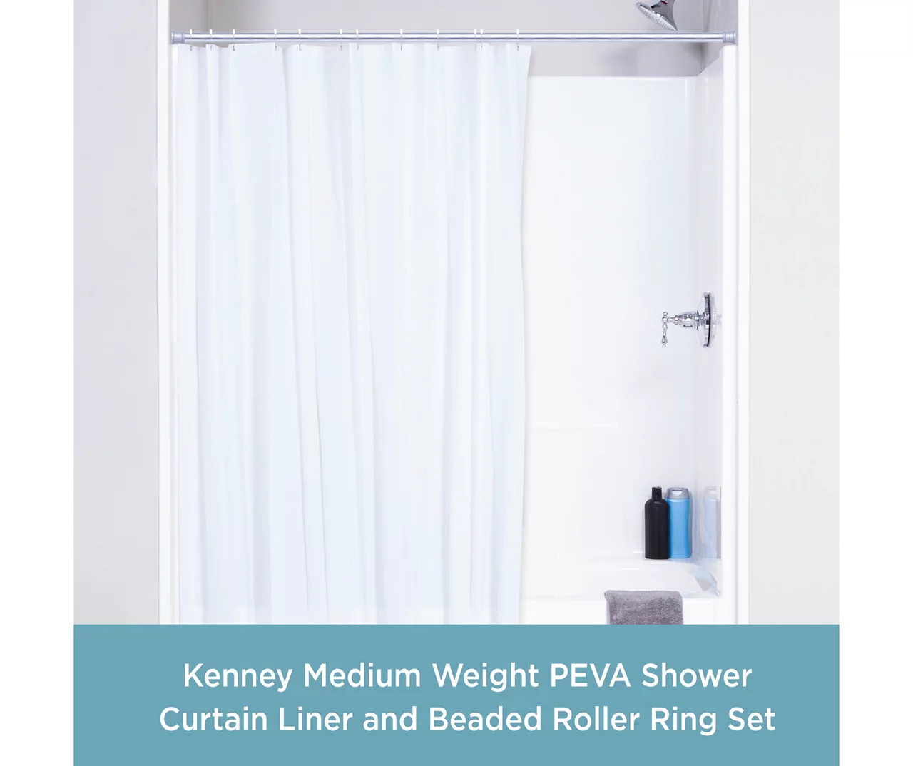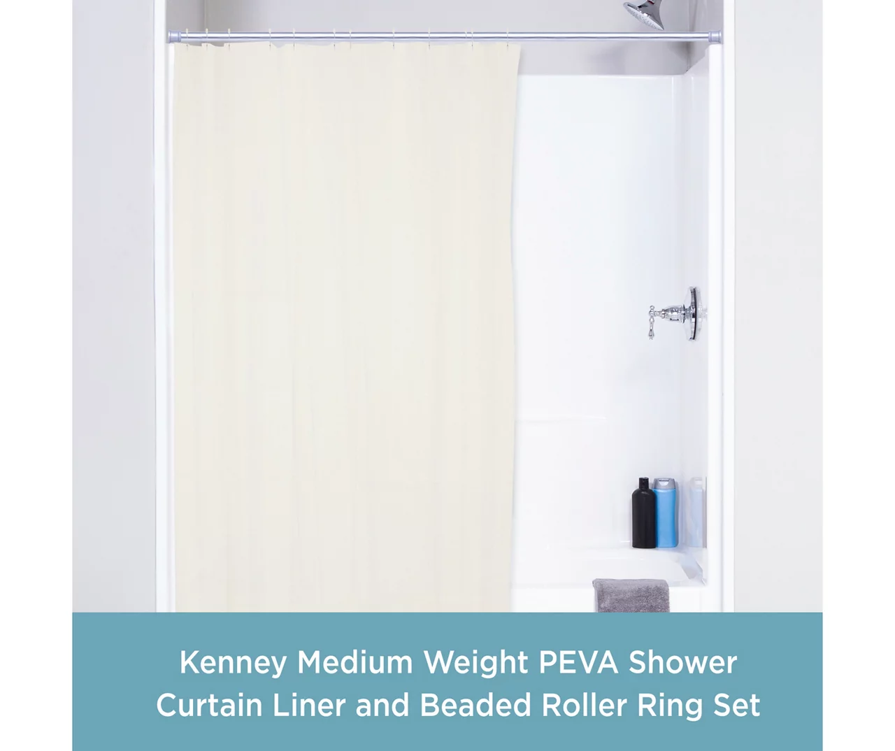 Update the look of your bathroom with this color-coordinated Kenney® liner and roller ring set. The set includes 12 metal shower rings with colored beads that allow the rings to glide effortlessly across your shower rod. Use the matching liner as a stand-alone shower curtain, or layered with a decorative shower curtain. Made of medium-weight PEVA, this liner is PVC-free and odorless. The liner has 12 reinforced holes to prevent tearing.