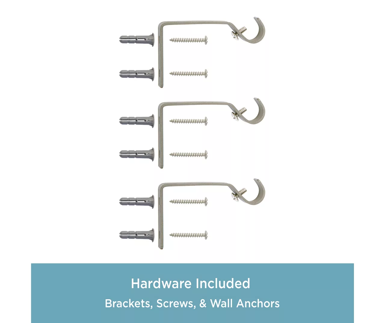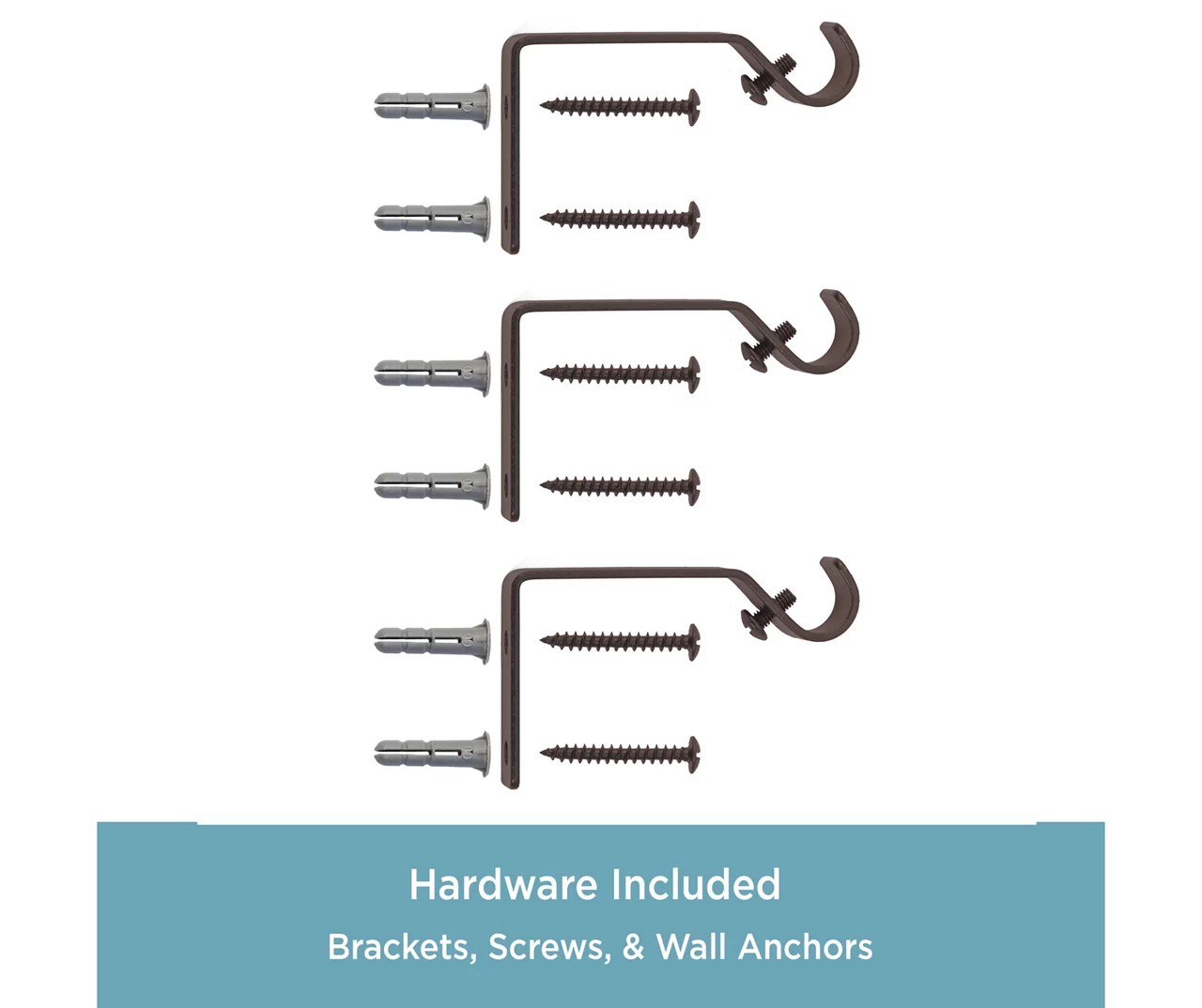 - Includes 1 telescoping curtain rod with finials, 2 brackets, 1 center support, screws, drywall anchors and installation instructions