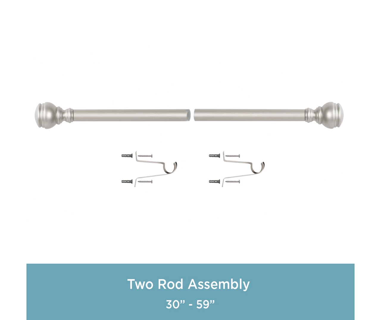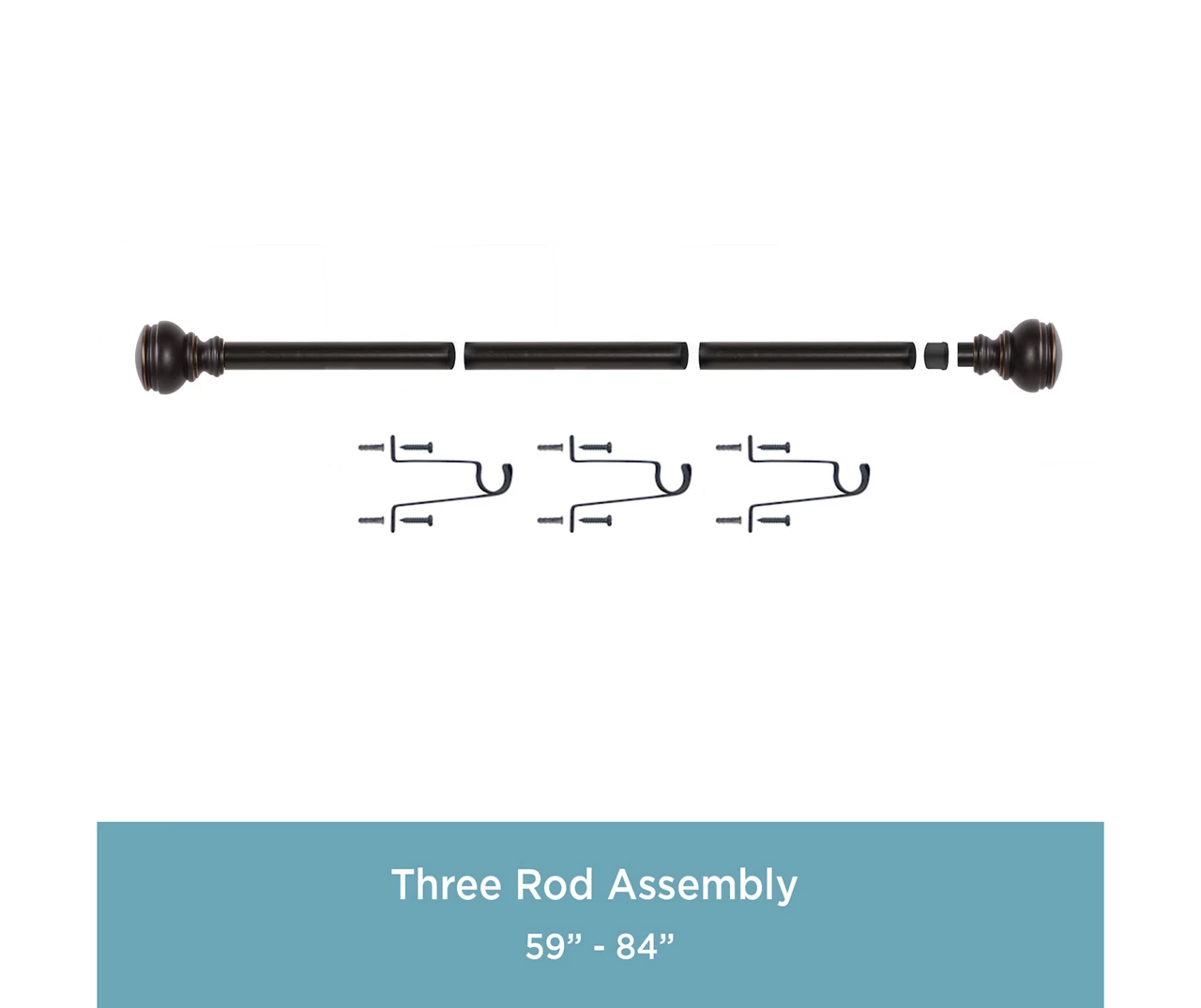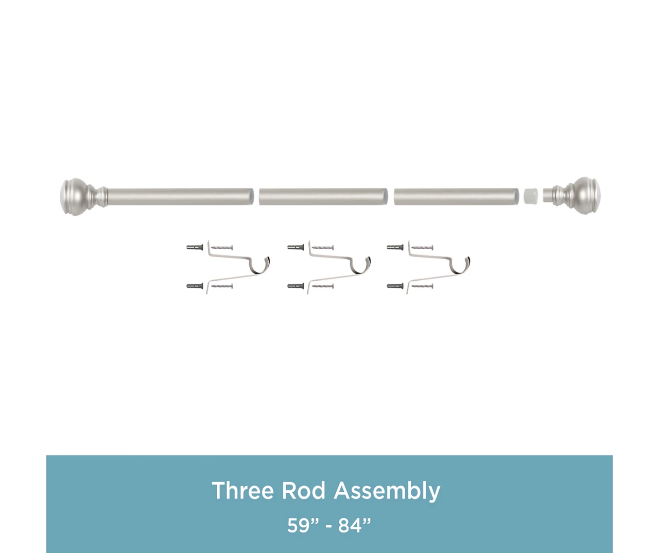 - Includes 1 telescoping curtain rod with finials, 2 brackets, 1 center support, screws, drywall anchors and installation instructions