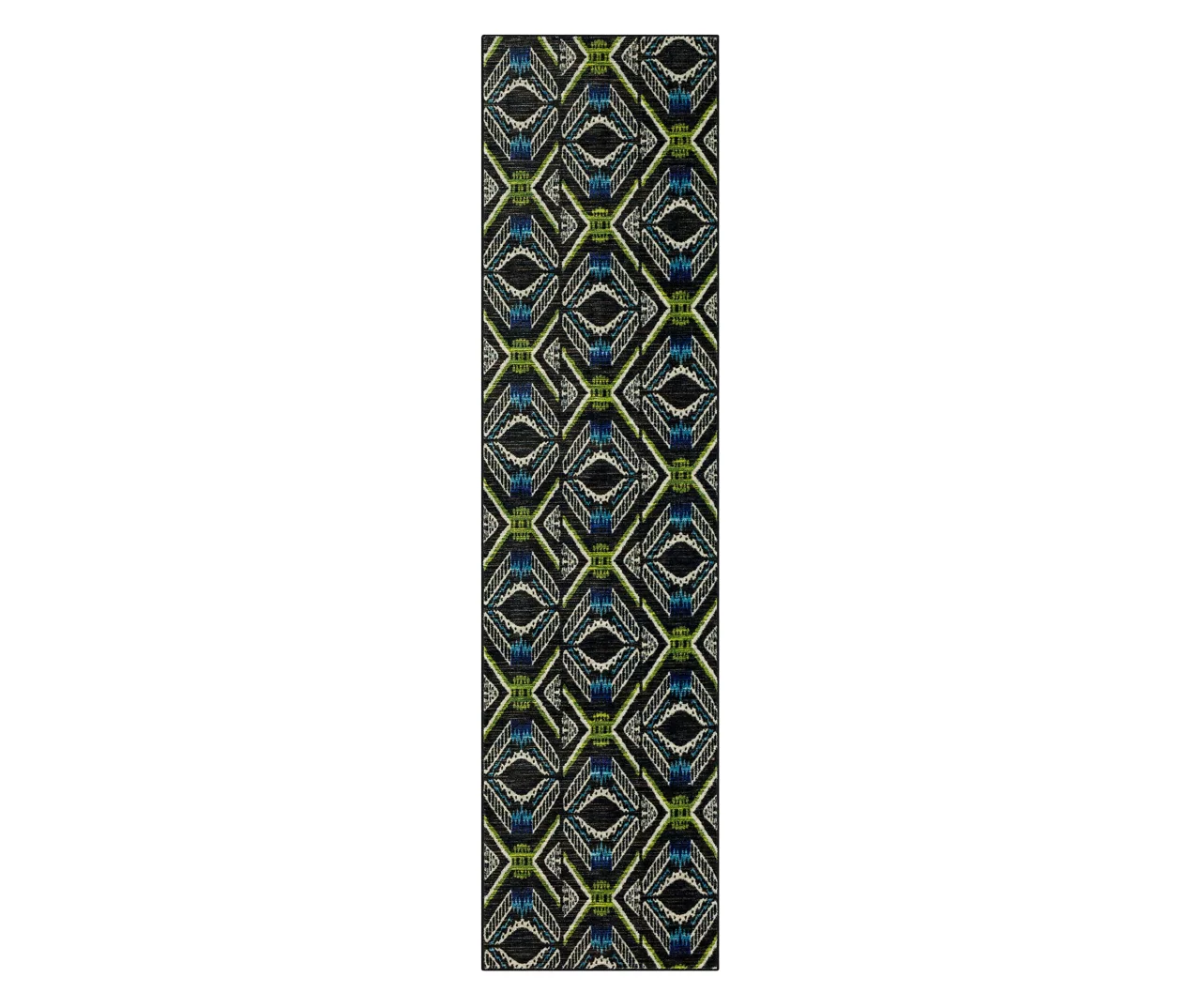 Mohawk Home’s Celinda area rug features a black striated background overlaid with a bold geometric pattern with pops of green, blue, and cream. Thoughtfully crafted in the U.S.A. utilizing Mohawk Home’s exclusive precision dye-injected printer, this rug is designed on a plush EverStrand™ tufted base made from premium recycled polyester. A non-skid latex backing helps to keep things in place, and the low pile is durably designed to easily work with doorways or furniture while withstanding everyday use.
