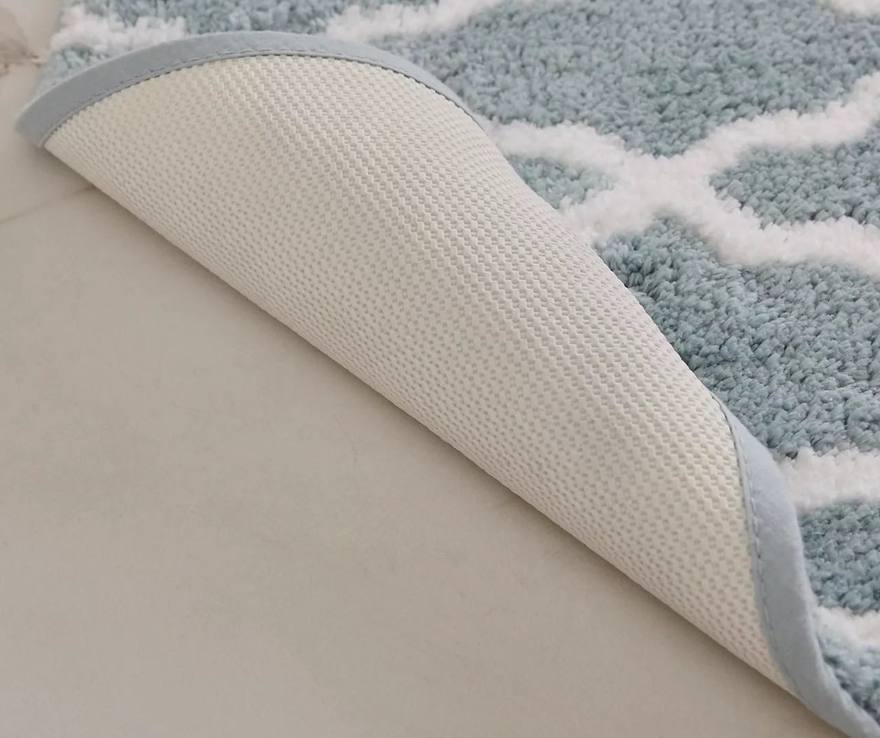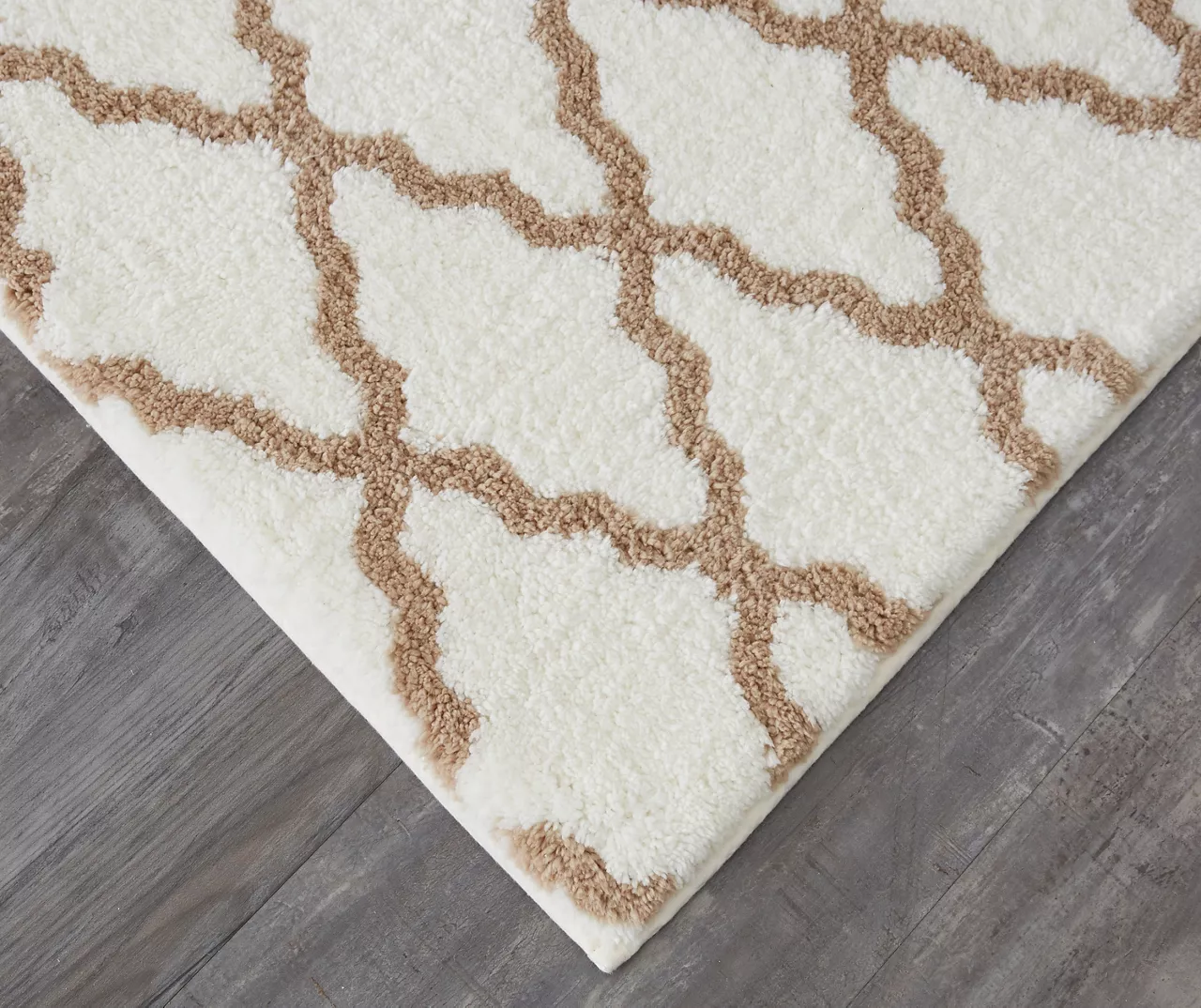 A two-tone zigzagging lattice pattern gives modern boho flair to this lovely Pueblo bath rug from Mohawk’s Horizon collection. The soft and plush polyester pile keeps feet comfy when you step out of the shower, and it’s machine wasable for easy care.