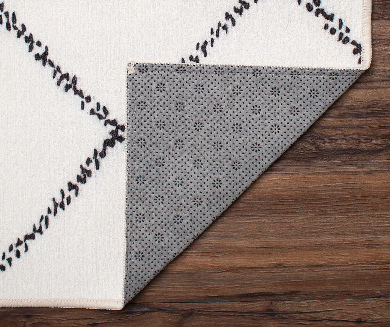 Snag this eye-catching yet understated decor staple! The Moroccan diamond rug in ivory features a neutral color story that suits just about every decor style. Easily style this versatile piece in your master bedroom, living room, entryway or RV, and watch this trendy rug quickly become the focal point. Protect your floors from spills and scratches and wash away germs with a full line of no-fuss rugs. My Magic Carpet is an eco-friendly alternative to traditional rugs. This rug is made of non-allergenic, stain-resistant microfiber polyester, with a waterproof inner liner and a non-slip backing.