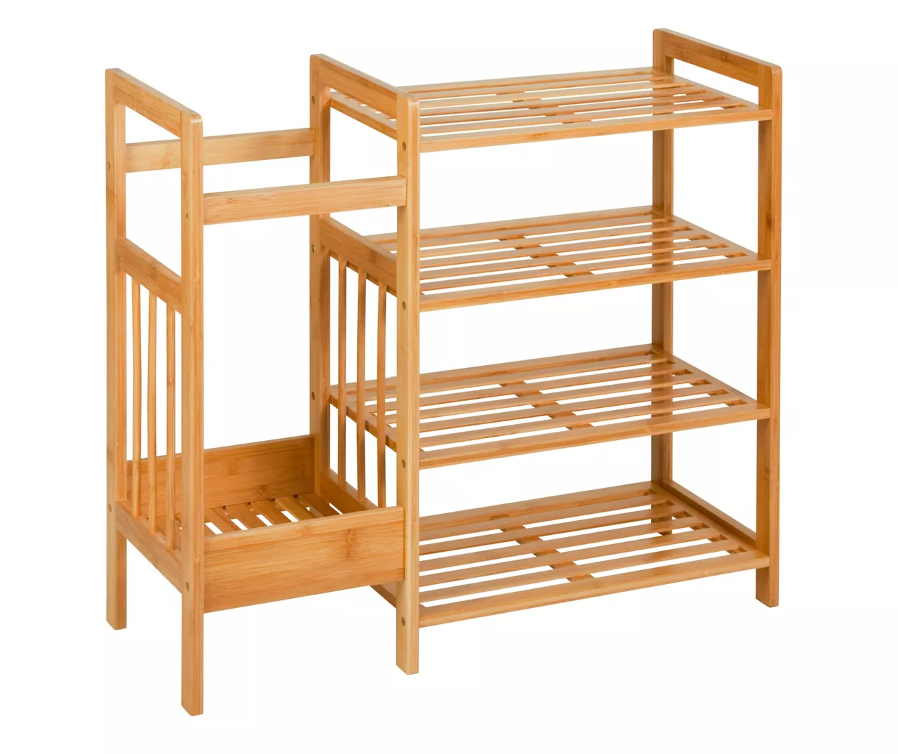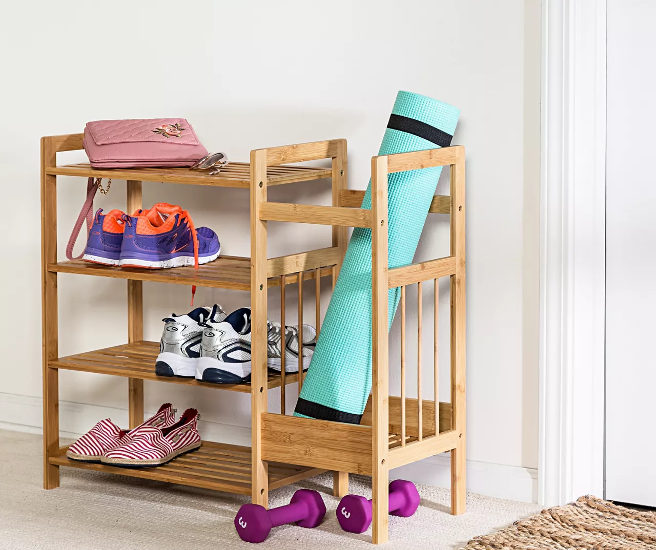 - Four tiers for storing shoes and one side compartment for umbrellas, yoga mats or other taller items