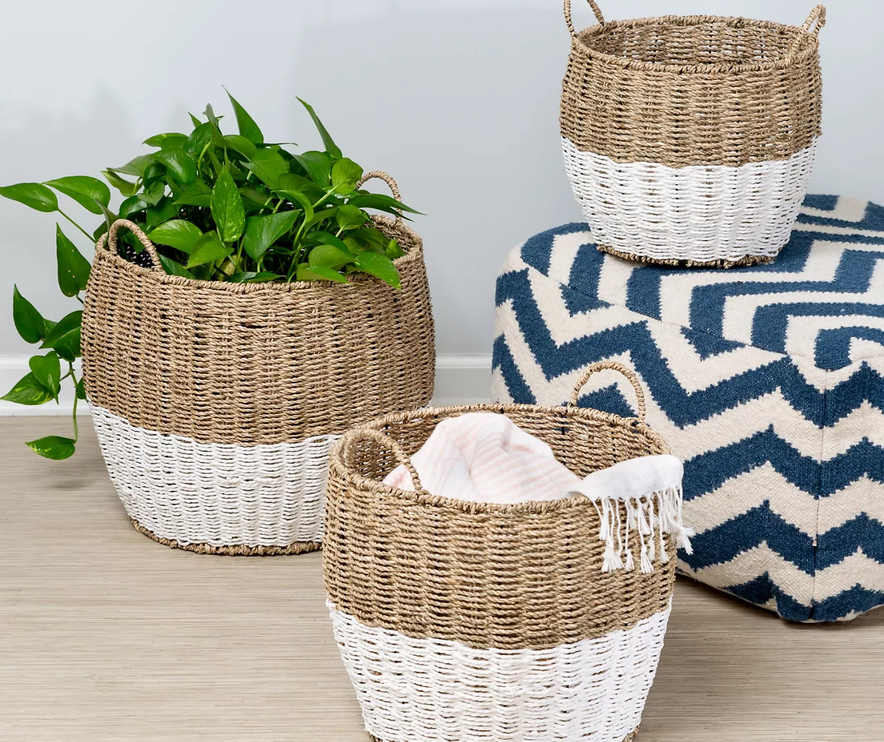 - Baskets can nest in each other for space-saving storage while not in use
