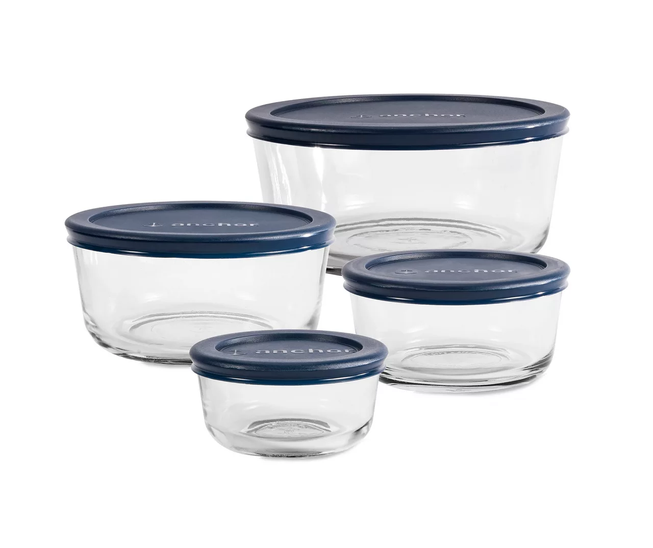Cook, bake and create, then store your culnitary masterpieces in these convenient containers from Anchor Hocking. Featured in a 1 cup to 7 cup design with navy blue lids, they each feature glass constructions that are microwave, oven, freezer and dishwasher safe. They’re great for meal prep, leftovers, travel use and more.