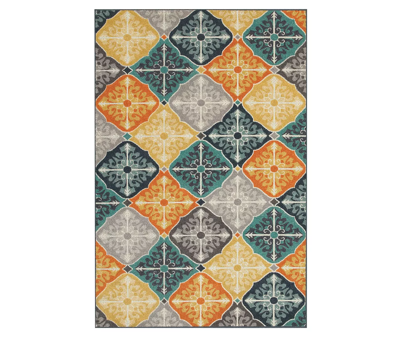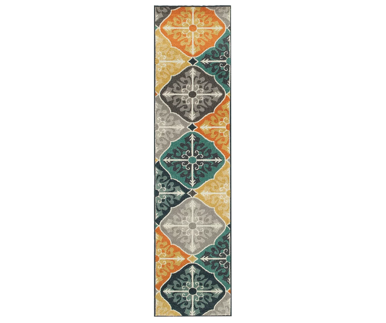 Accent your home in ornate beauty with this stunning area rug. Gorgeous ironwork patterns in shades of persimmon orange, gray, teal and gold grace the front of this rug as it displays in your basement, living room or dining room in sophisticated style. Woven with a cut loop construction for adding interesting textures to your space.