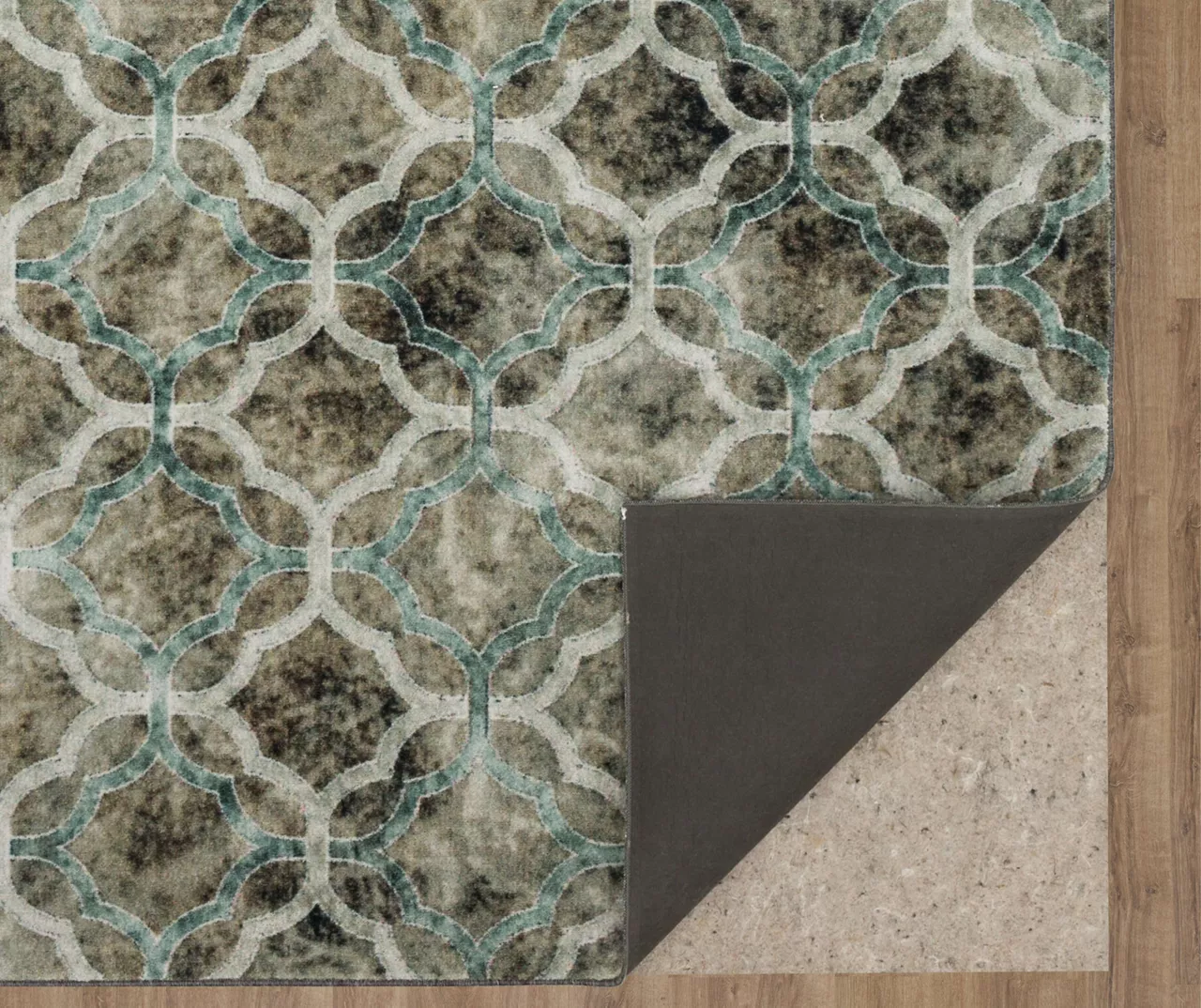 Washes of gray, beige and dark teal create a dimensional background beneath the lattice motif of Mohawk’s Quatrefoil Fret area rug. Thoughtfully crafted in the U.S.A. utilizing Mohawk Home’s exclusive precision dye-injected printer, this rug is designed on a plush EverStrandâ„¢ tufted base made from premium recycled polyester. A non-skid latex backing helps to keep things in place, and the low pile is durably designed to easily work with doorways or furniture while withstanding everyday use.