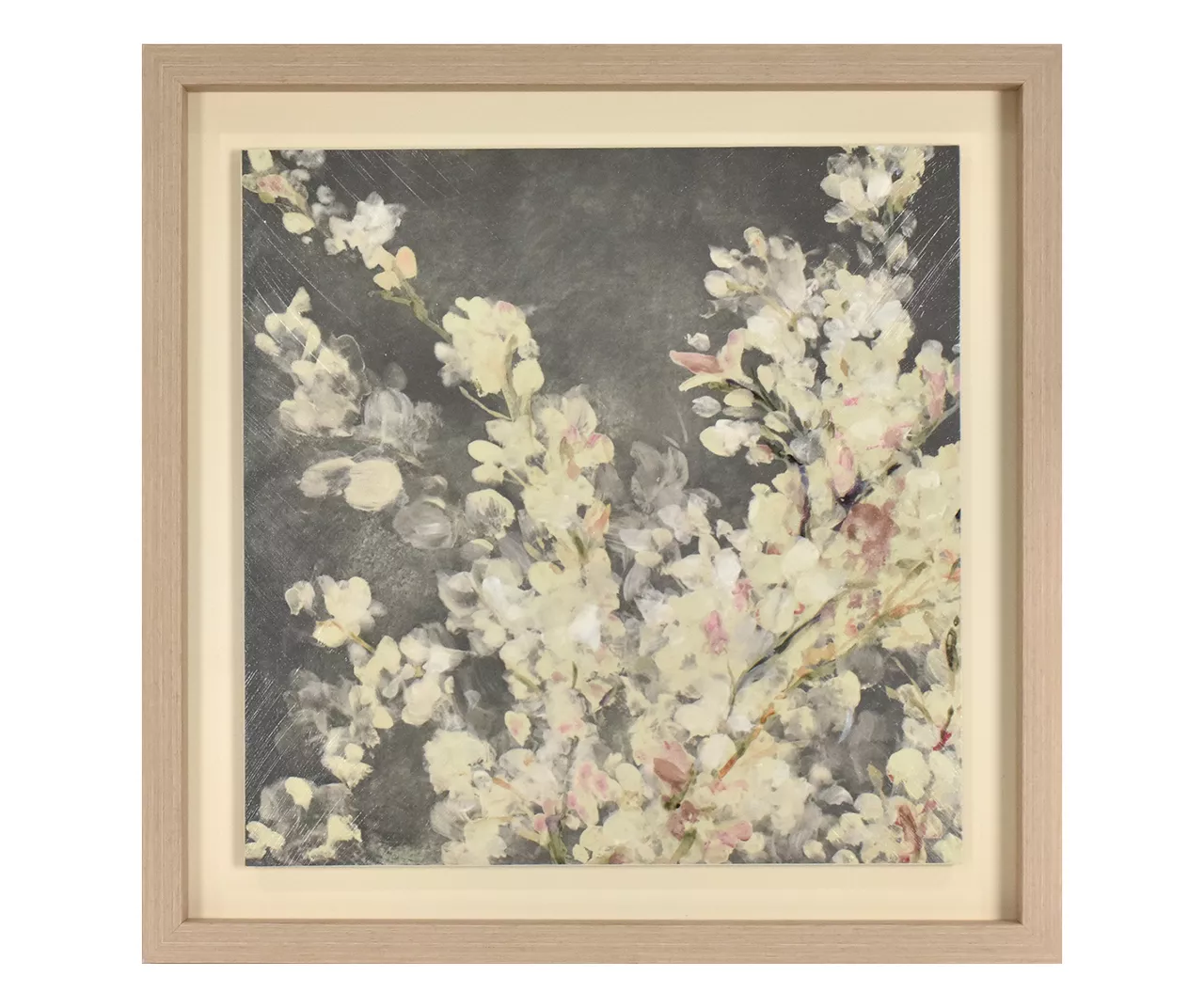 This art piece captures the beauty of a Sakura blossom tree. Petals in multiple shades of white and pink are illustrated on a contrasting gray background and surrounded by a window mat.