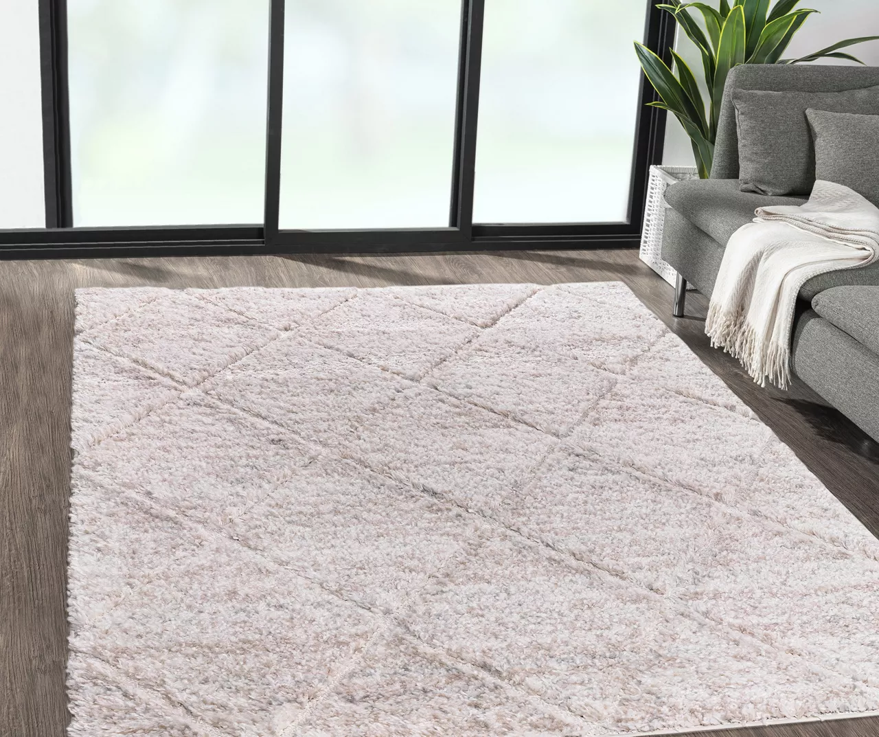 Bring a soft and elegant touch to your home decor with the Sophie area rug boasting a supersoft high pile with a cream diamond trellis pattern for a modern and stylish update. Tassel detailing adds rich texture and an artisan touch, while a sprayed transparent latex reverse helps prevent the rug from sliding making it well-suited for high-traffic areas. Easy to clean with a brushless vacuum or by spot cleaning, while also resistant to staining and fading, this shag area rug is the perfect update for a cozy yet fresh update.
