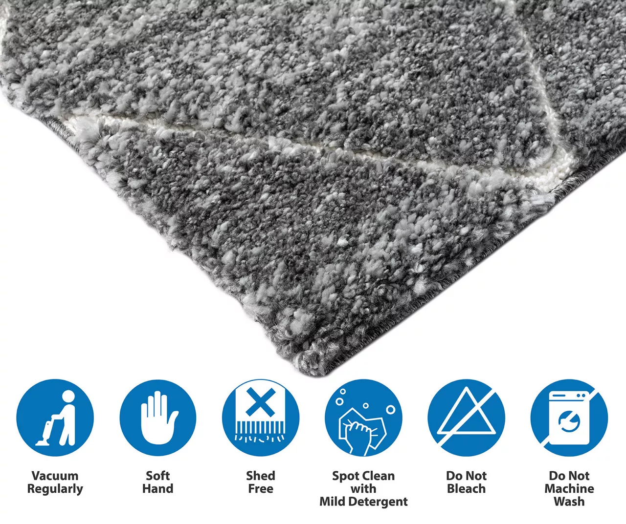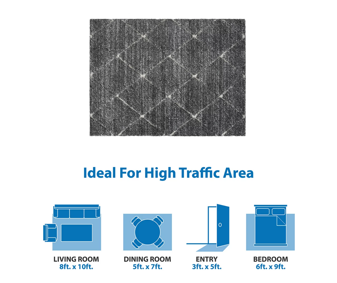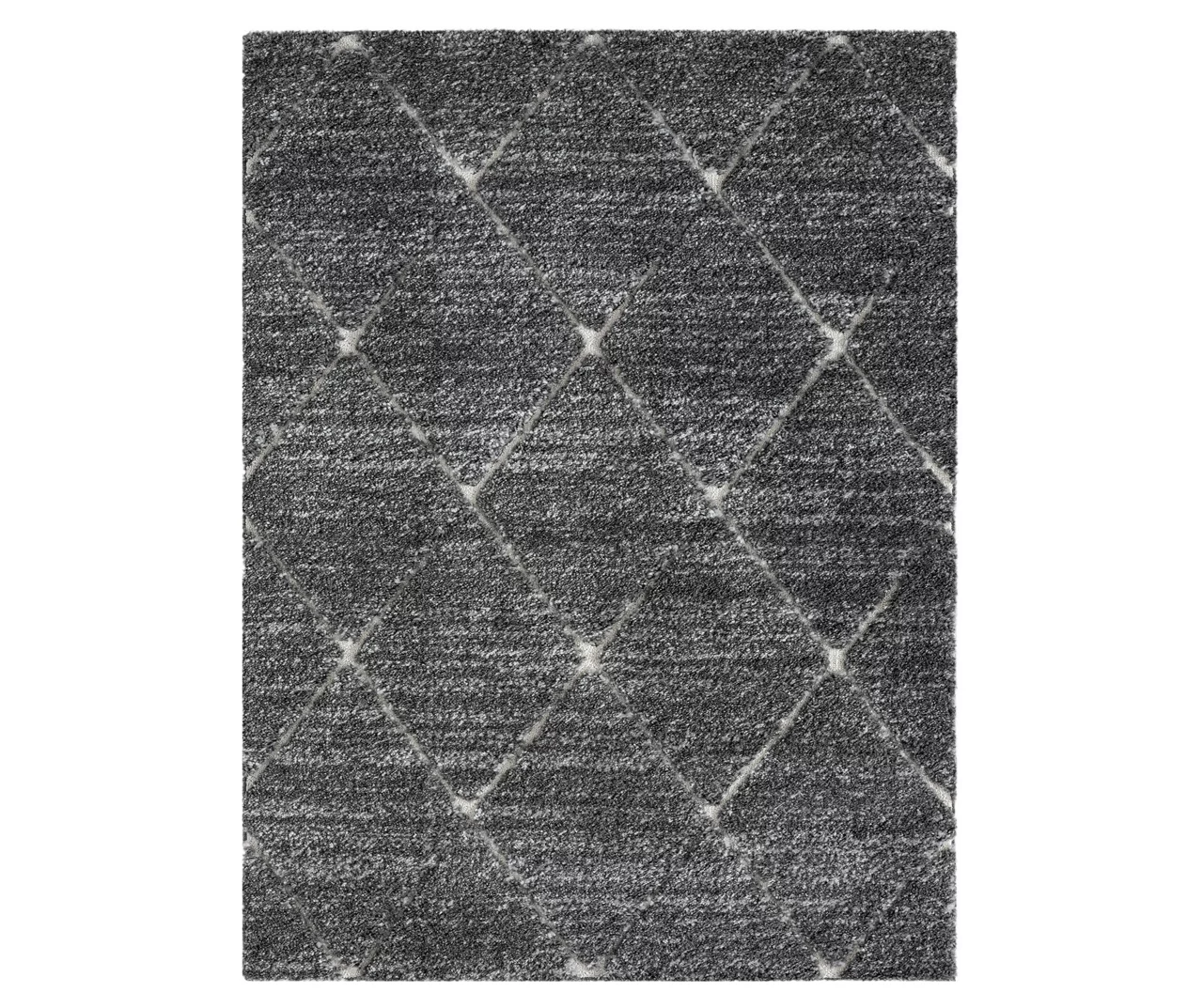 Bring a soft and elegant touch to your home decor with the Sophie Talas area rug. This machine-woven, plush rug features a high pile construction with a gray and cream diamond trellis pattern for a modern and stylish update. Tassel detailing adds rich texture and an artisan touch, while a sprayed transparent latex reverse helps prevent the rug from sliding making it well-suited for high-traffic areas. Easy to clean with a brushless vacuum or by spot cleaning, while also resistant to staining and fading, this shag area rug is the perfect update for a cozy yet fresh update.