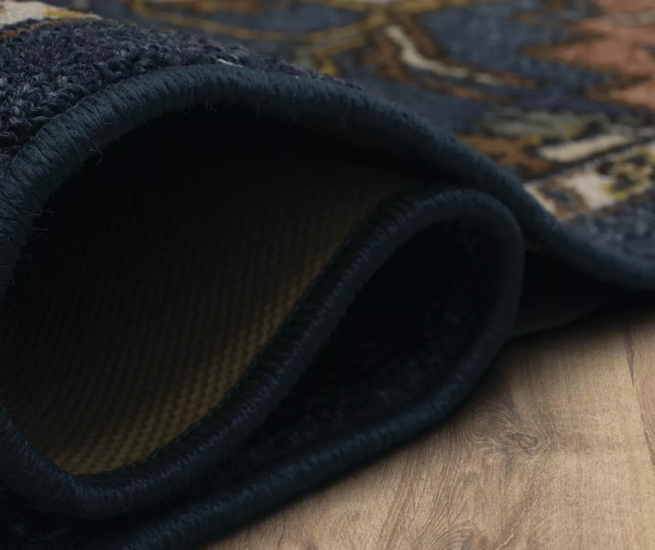 - Ornamental design with geometric elements in shades of navy and brown for a traditional look
