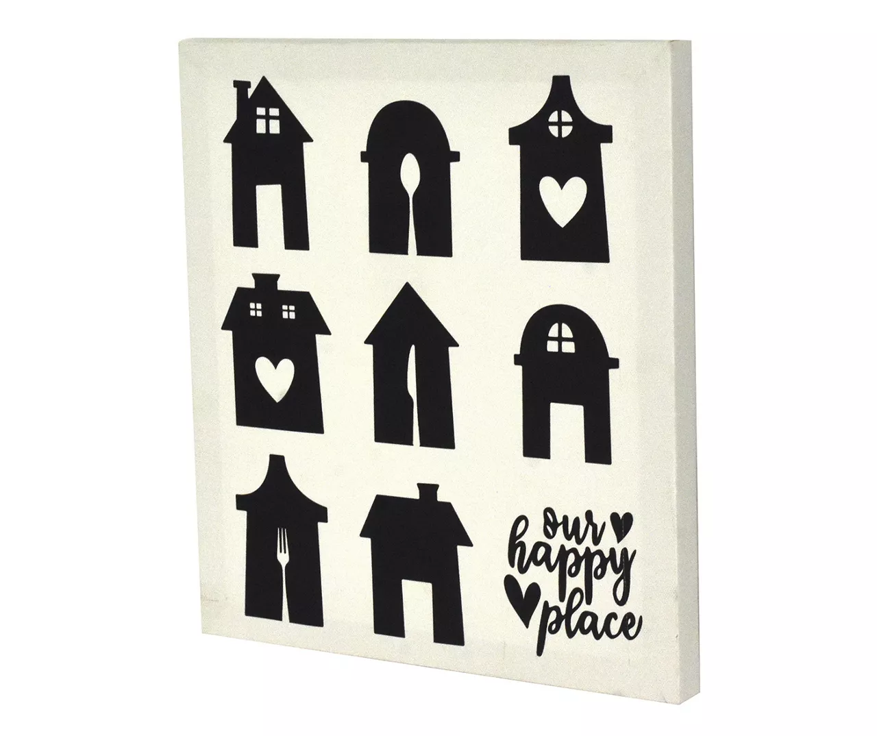 This art canvas set brings warm sentiments to your kitchen or dining space. One reads “The Kitchen, The Heart, The Home” as the other displays “Our Happy Place” with charming rows of houses with cutlery.