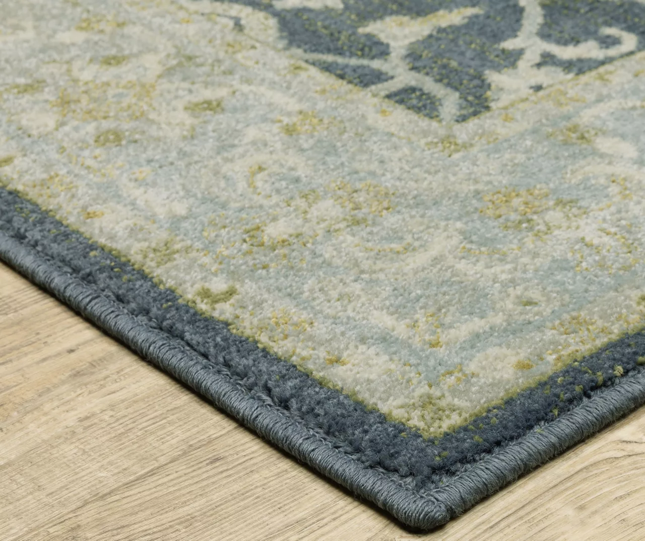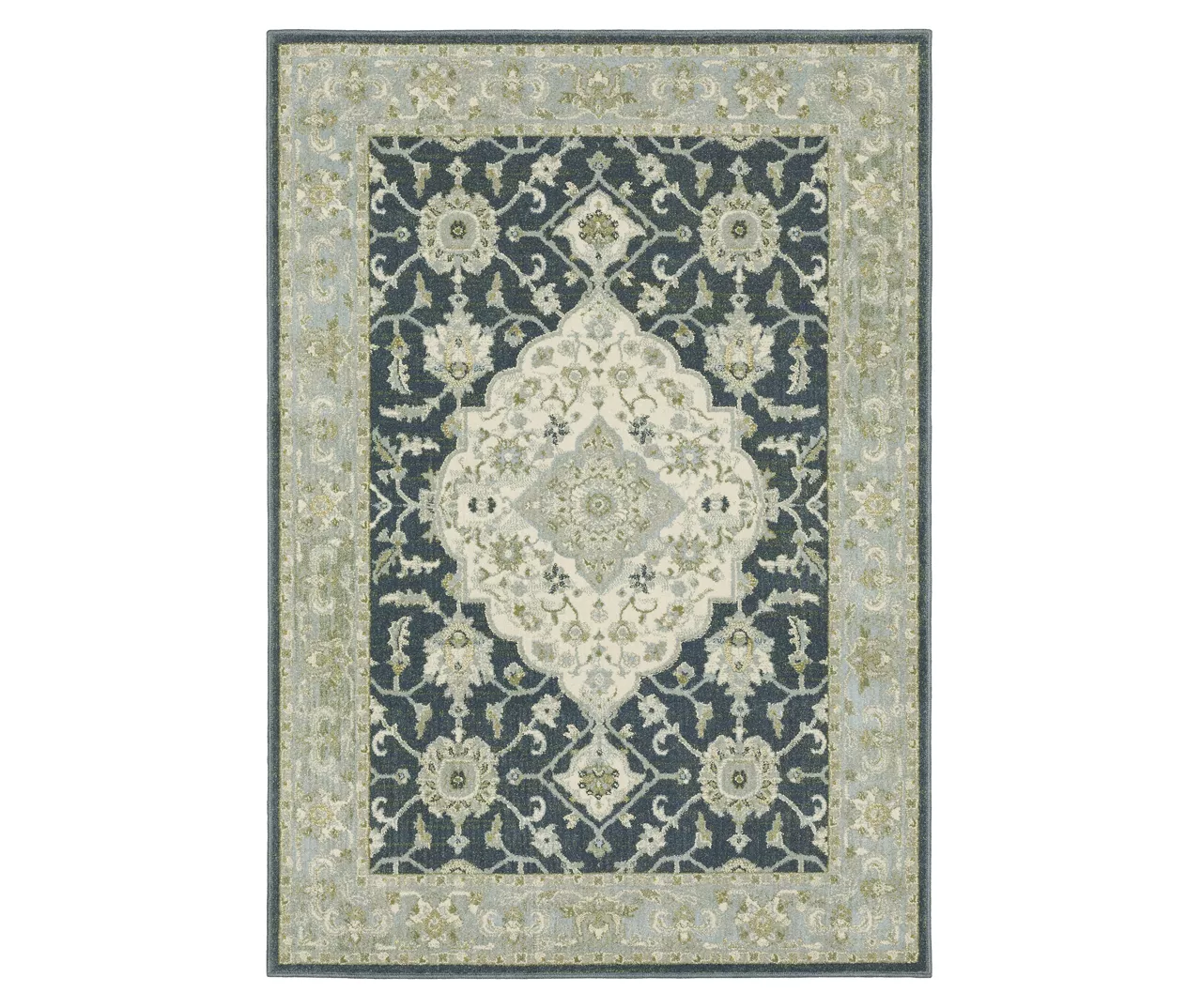 The Thornfield collection is power-loomed in the USA from tri-colored and textured polypropylene yarn. It features a floral medallion design in beautifully updated, yet classic colors of deep navy, cool soft blue, moss green and neutrals. The multi-colored yarns add depth and visual interest to the designs and the textured effect creates a very soft feel underfoot.