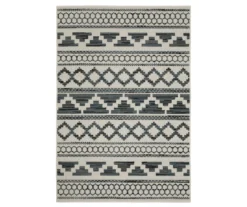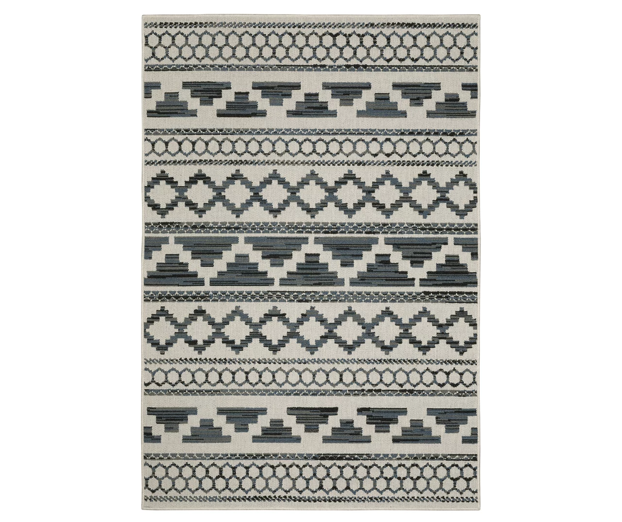 The unique power-loomed construction of the Torao collection features both flatwoven and loop piles, giving the rug a soft, textured feel underfoot that’s durable enough to enjoy both indoors and outdoors. The cozy fibers are defined by a geometric stripe design in shades of black, gray-blue and beige for a decorative complement inspired by the American Southwest that easily fits into your living and patio spaces.