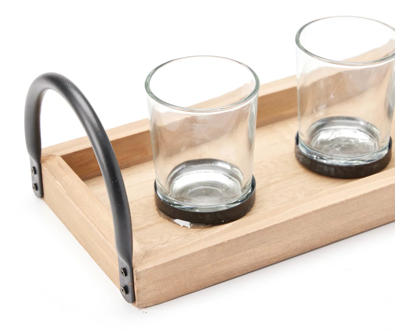 Create an inviting centerpiece on a dining table, coffee table or mantel with this lovely votive holder featuring three glass jars on a wooden base with metal handles. The neutral palette makes it easy to complement and coordinate with your exisiting décor.