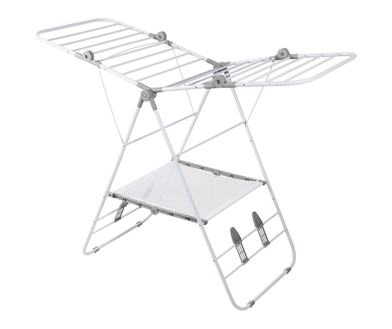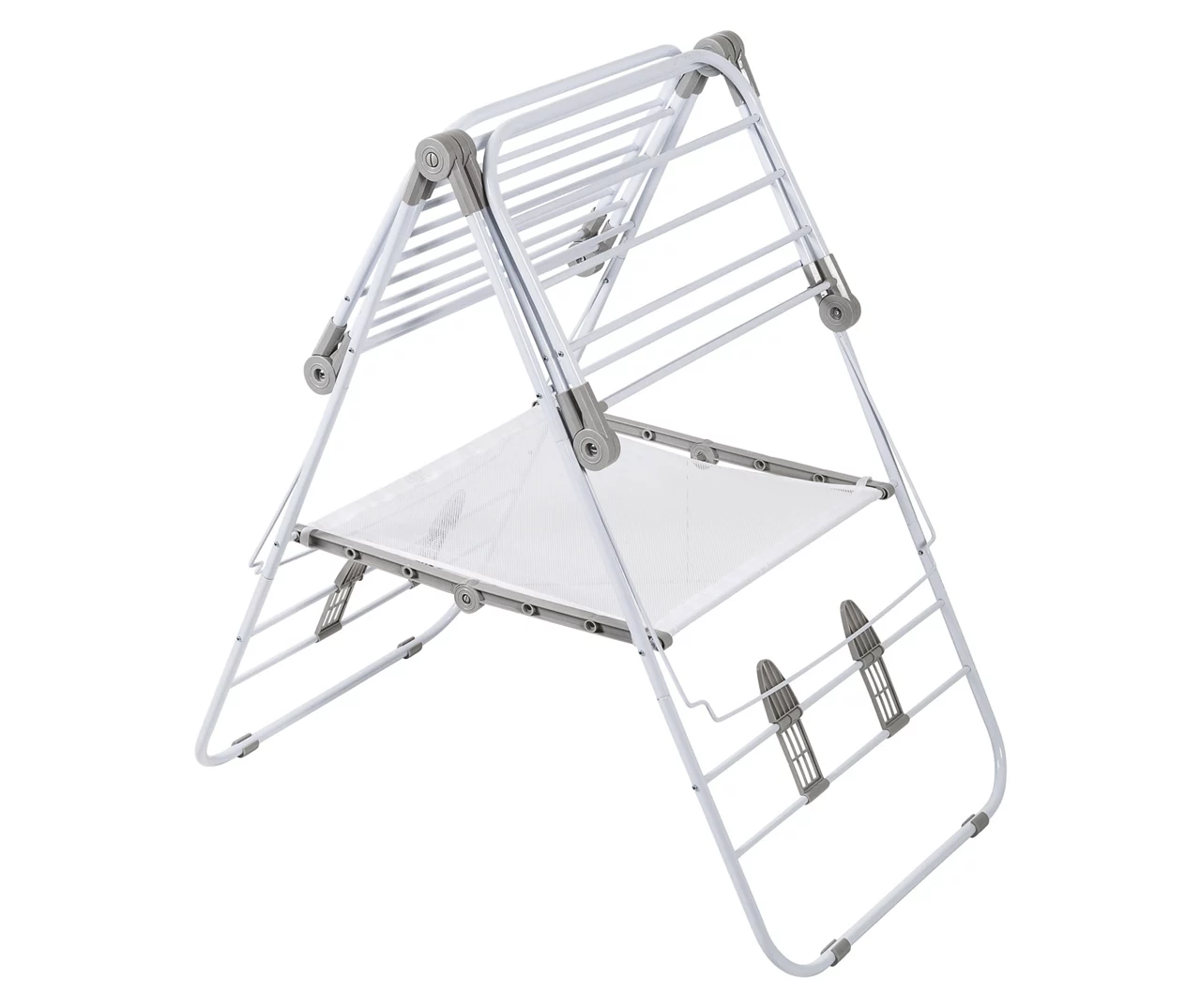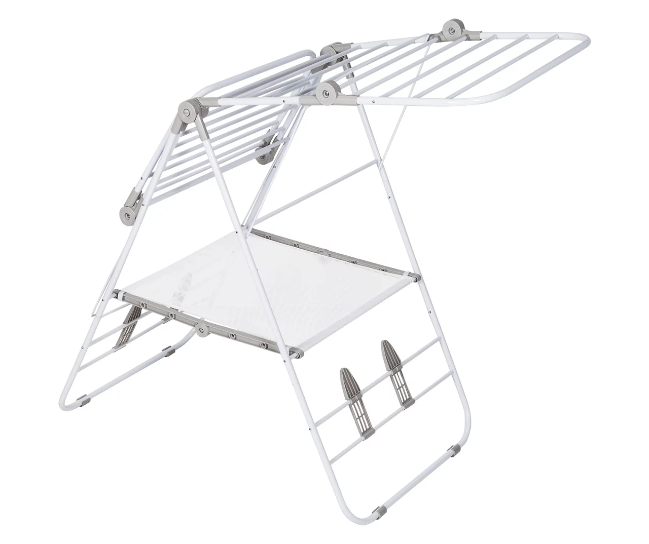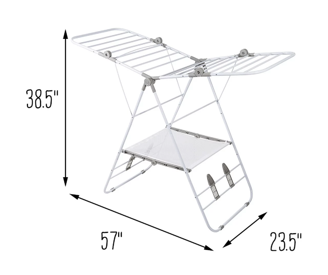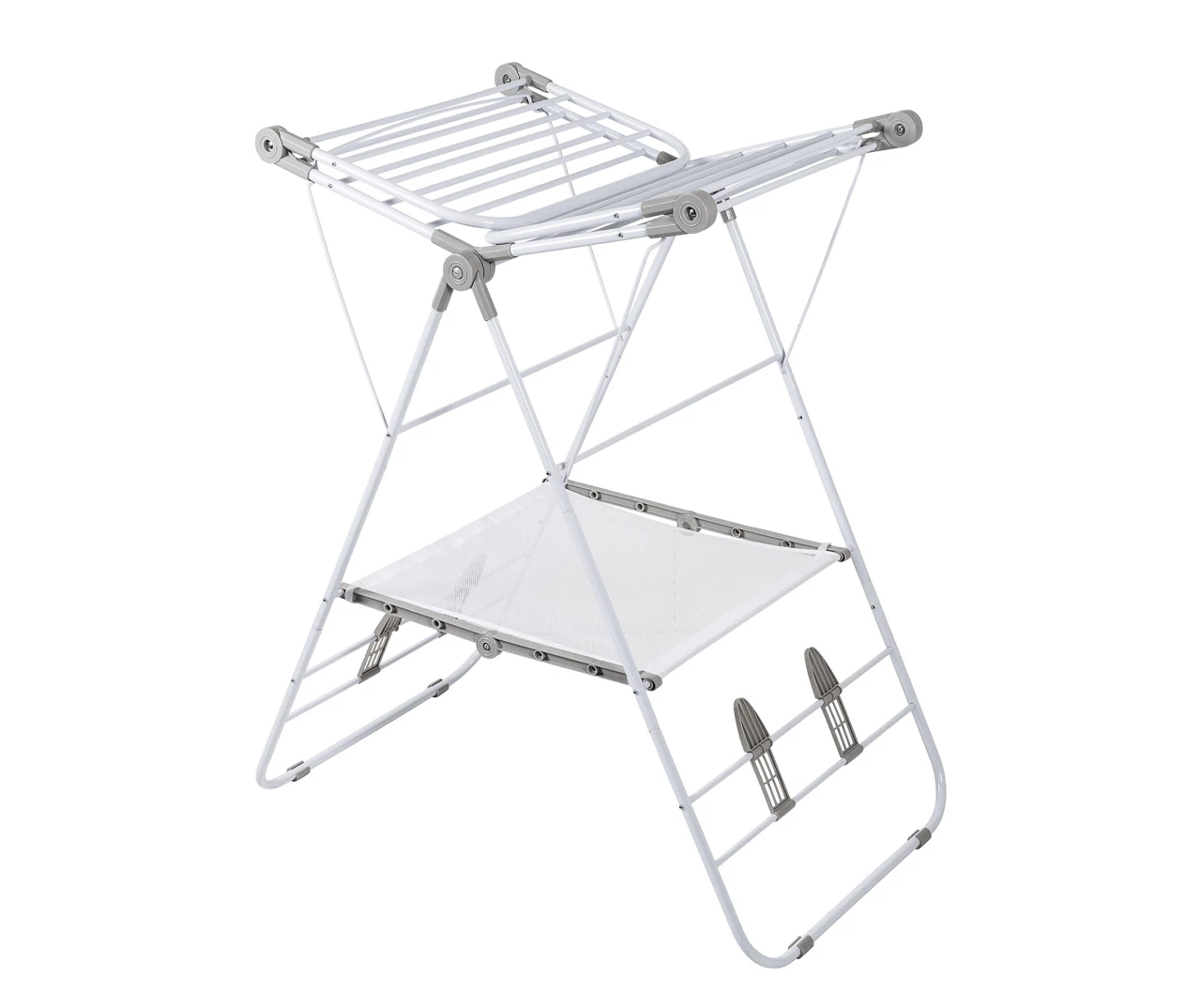 Equipped with 42 linear feet of drying space that can hold up to 20 garments (or 40 lbs.), this Honey-Can-Do drying rack features a patented design with smooth fold hinges that allow the powder-coated steel wings to fold out into multiple positions for maximum drying space. It also boasts a mesh shelf for those delicate pieces that need to be laid flat to dry. Once everything is ready to be folded, the A-frame folds down to 3 inches for easy storage.