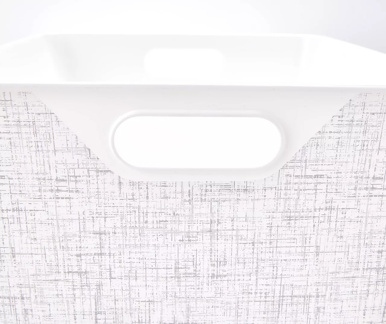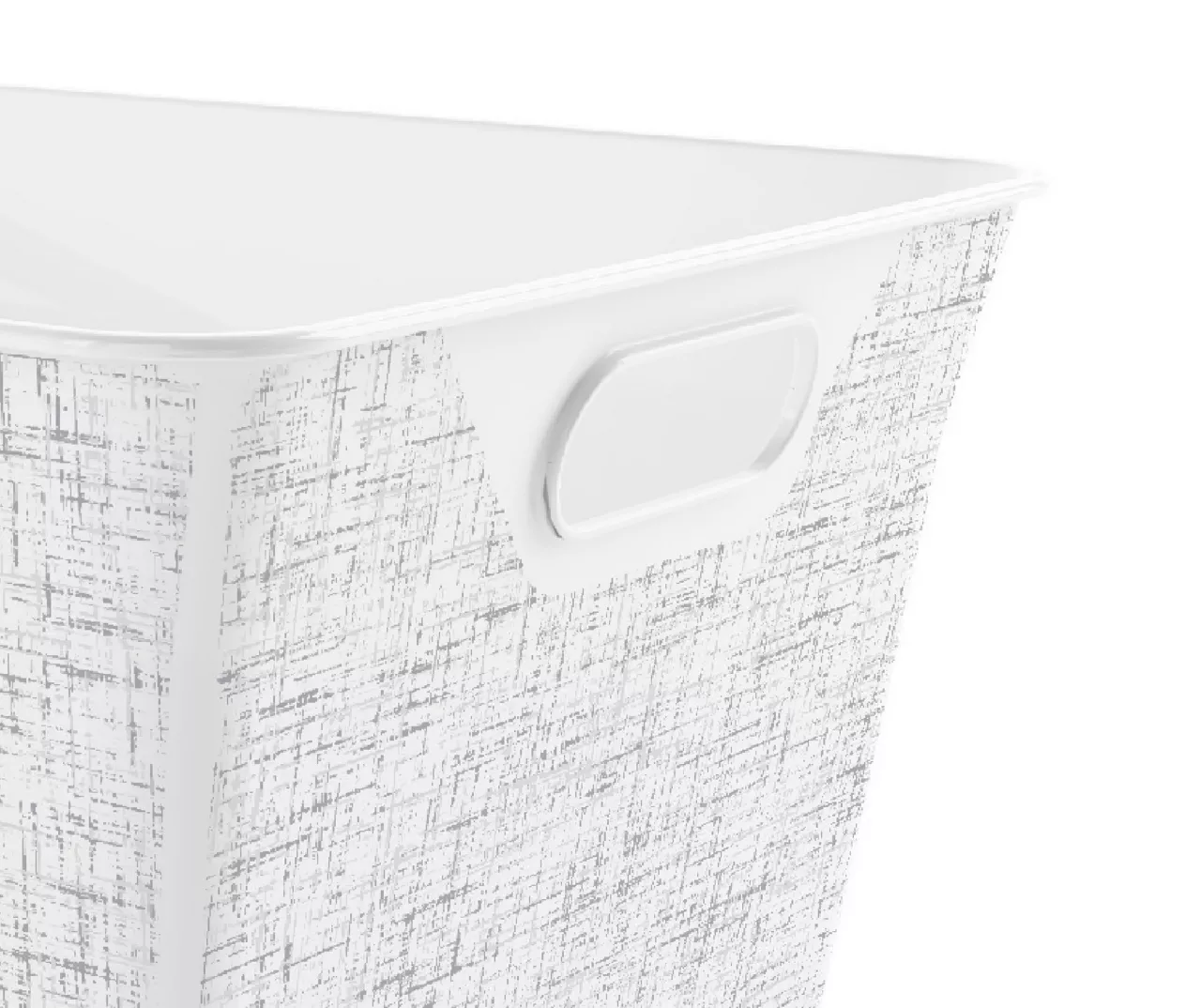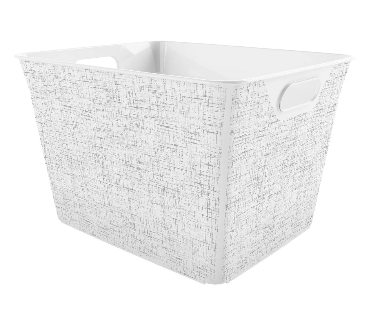 Keep your workspace and shelving organized with this storage basket from Curver. This decorative basket is ideal for use on open shelving or tabletops to keep small items and accessories contained and organized. The printed tweed pattern lends chic sophistication while side handles make it easy to carry or remove from shelves.